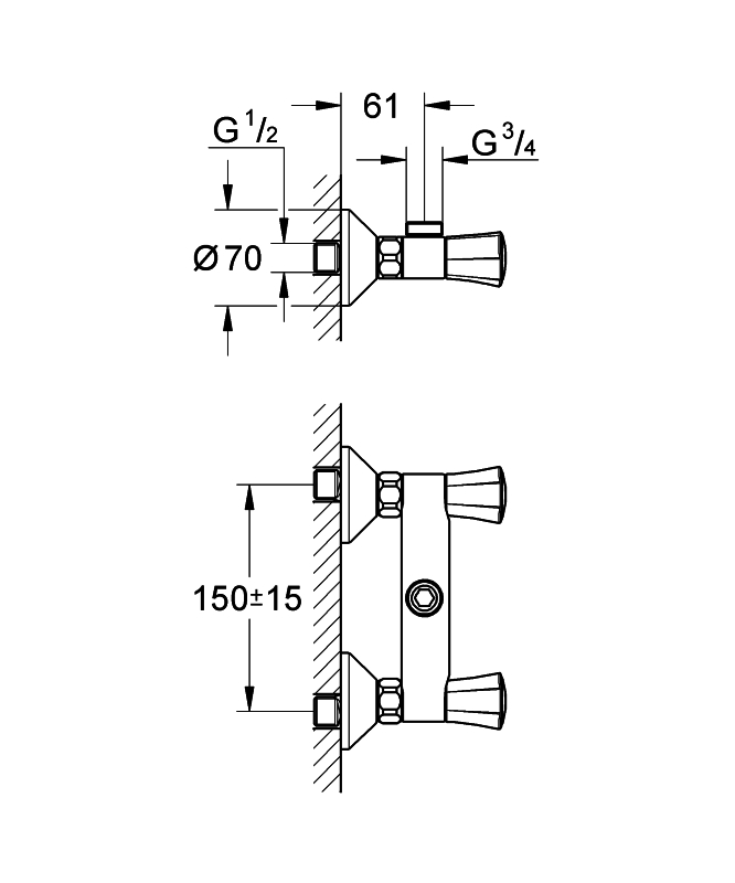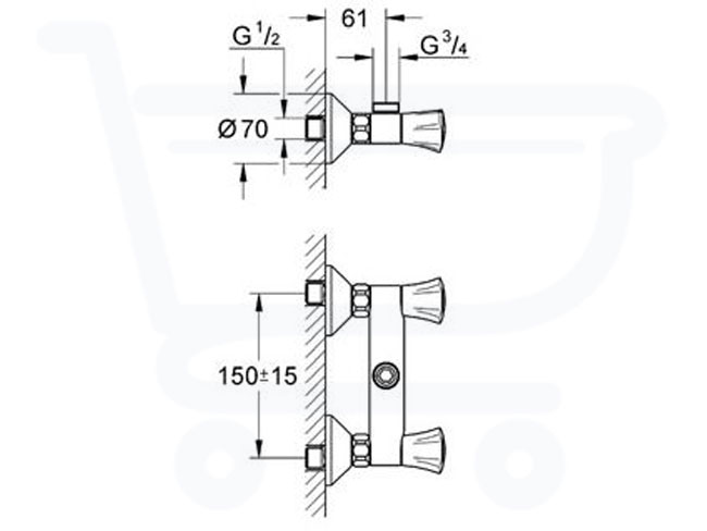 Afmetingen: Sprong: 61 mm Hart op hart afstand: 150 +/-15 mm