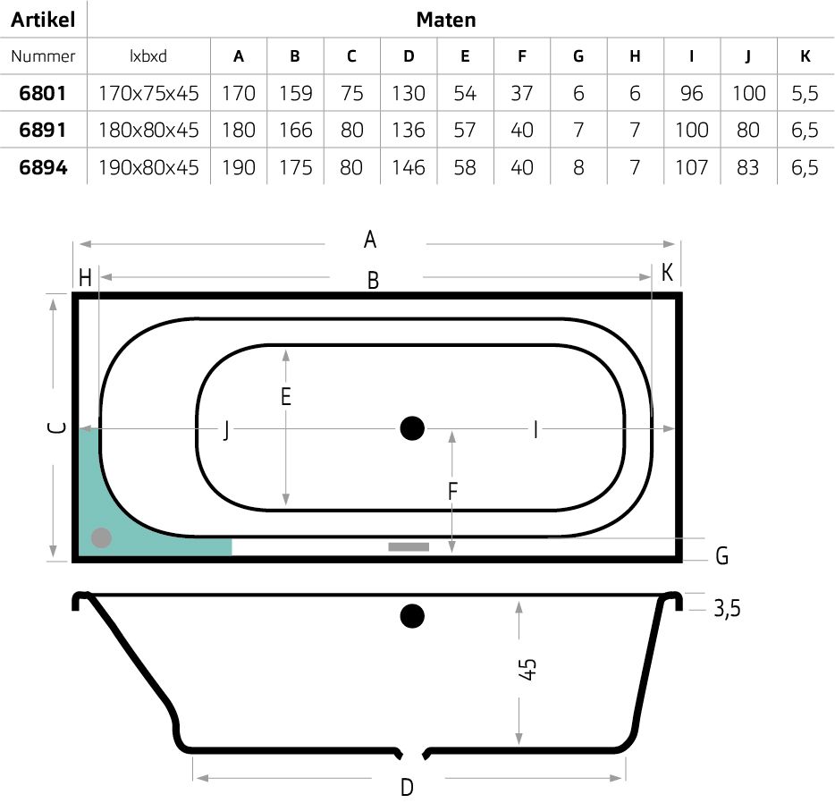 Xenz Aruba ligbad - 170x75cm - met overloop - zonder afvoer - acryl - glans wit