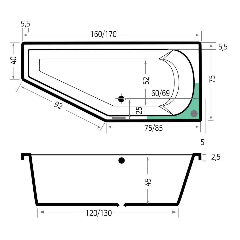 Xenz Lagoon compact ligbad - 160x75cm - met overloop - zonder afvoer - Hoekopstelling rechts - Acryl Edelweiss mat