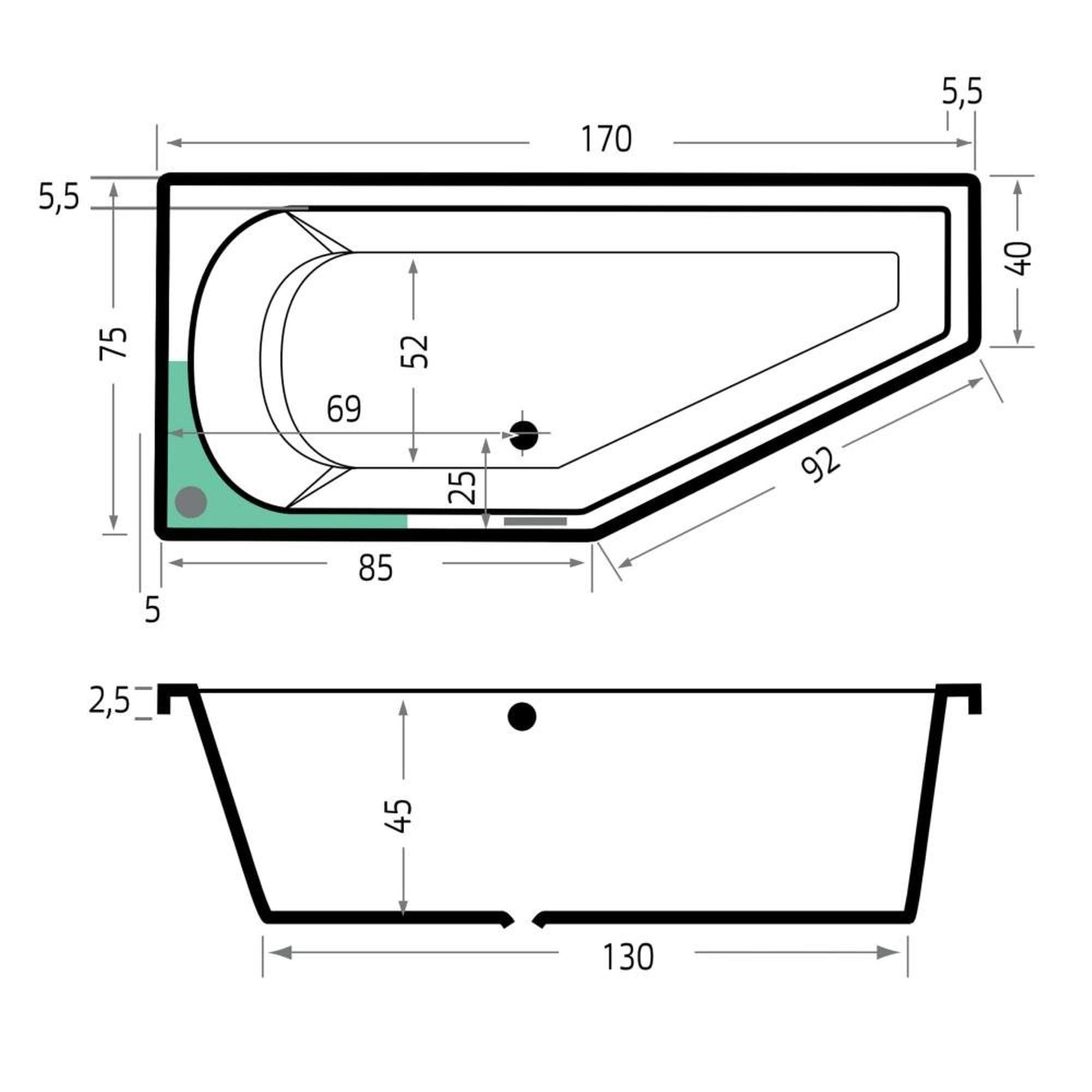 Xenz Lagoon compact ligbad - 170x75cm - met overloop - zonder afvoer - Hoekopstelling links - Acryl Wit