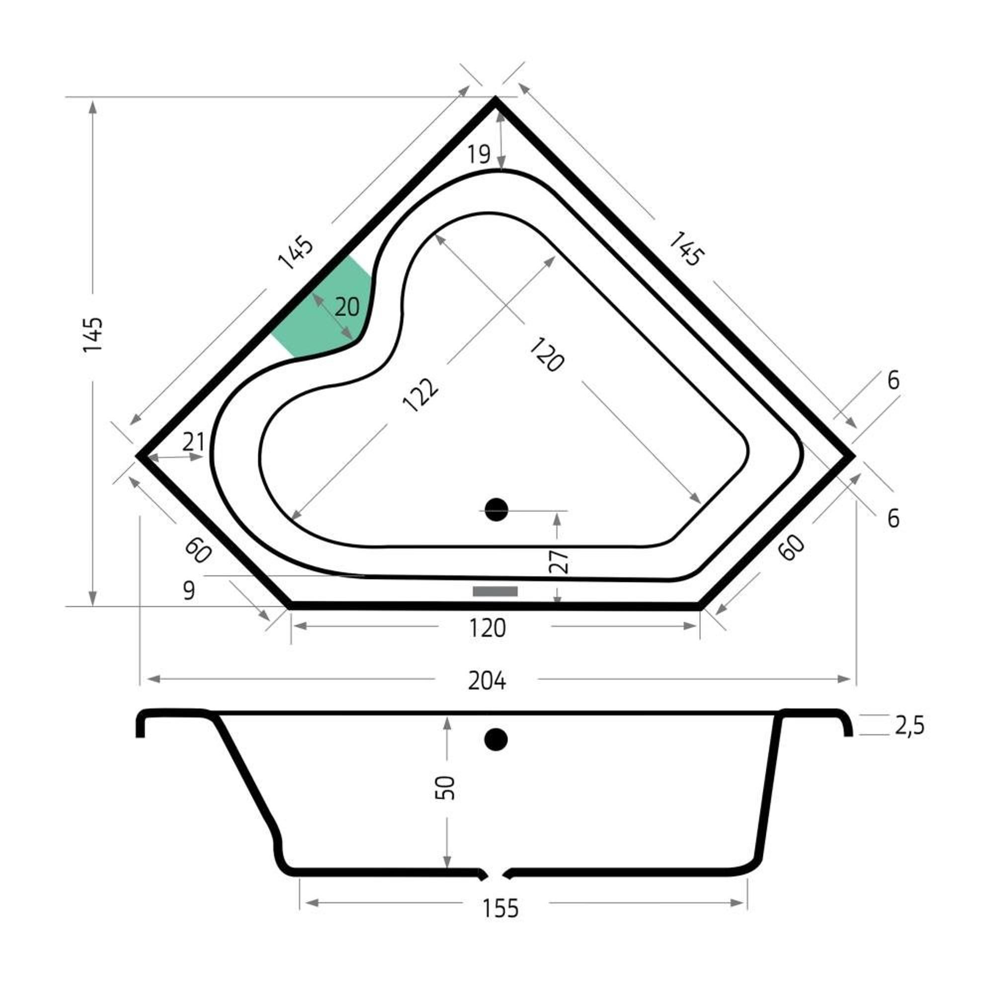 Xenz Cyprus hoekbad - 145x145cm - met overloop - zonder afvoer - Hoekopstelling links of rechts - Acryl Edelweiss mat