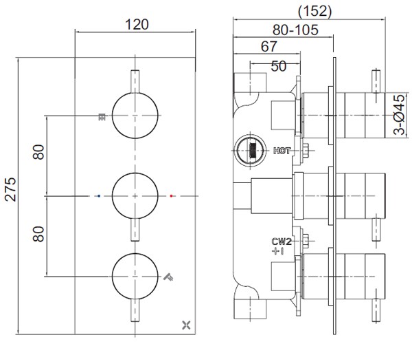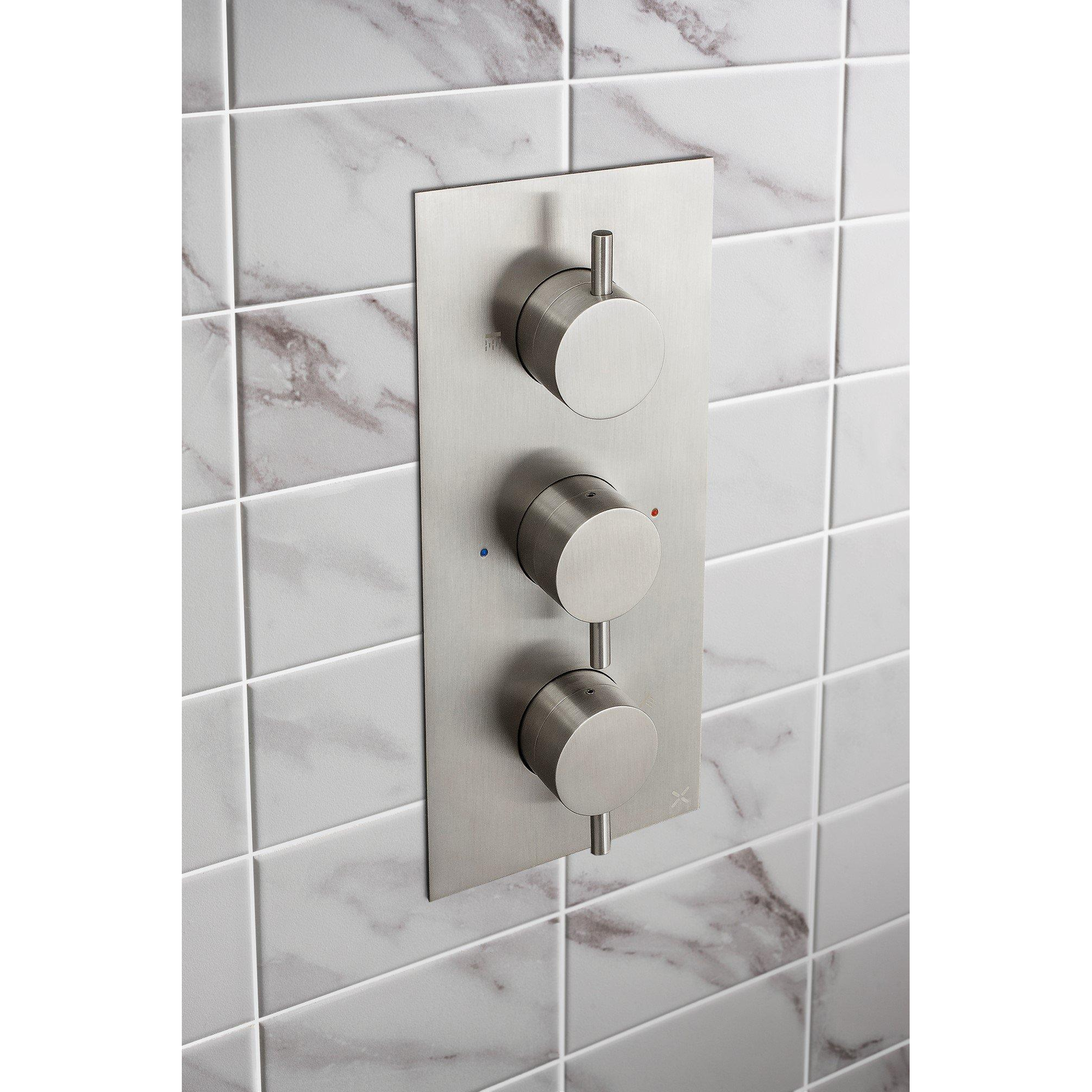 Deze RVS Crosswater MPRO inboJouw douchekraan wordt verticaal geplaatst en heeft drie knoppen. Eén knop gebruik je om de hoofddouche mee aan- en uit te zetten, één gebruik je voor de handdouche en met de laatste knop stel je de juiste temperatuur in. Je kunt ook kiezen voor een horizontaal exemplaar, een thermostaat met twee knoppen of deze uitvoering in een andere kleur, zoals messing en mat zwart. Ook is het mogelijk om voor een complete set te kiezen, waar de douchekop, handdouche en wand- of plafondarm al bij zitten.
