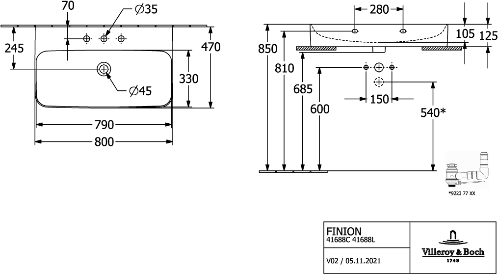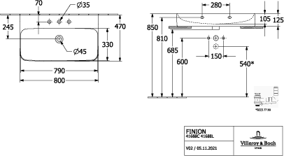 Villeroy & Boch Finion wastafel onderzijde geslepen 1 kraangat 80x47cm ceramic+ met verdekte overloop wit