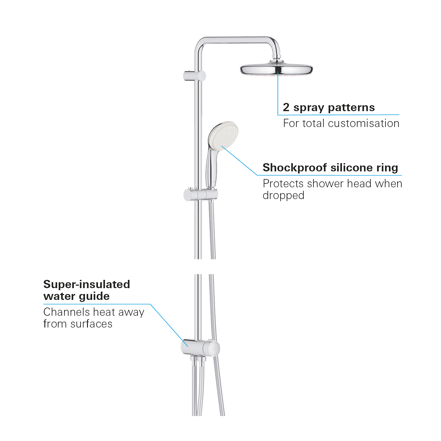 Een stijlvolle doucheset die perfect is voor een snelle upgrade en dat voor een geweldige prijs – door GROHE in Duitsland geproduceerd! Dit zeer aantrekkelijk geprijsde New Tempesta Cosmopolitan douchesysteem is de perfecte keuze voor de moderne badkamer. Zoals alle GROHE douchesystemen is hij eenvoudig te installeren en voorzien van de beste technologieën. De hoofddouche van 160 mm is kantelbaar en de handdouches bevat twee straalsoorten, inclusief de met lucht geïnjecteerde straalsoort GROHE Rain O². GROHE DreamSpray® zorgt voor een perfecte waterverdeling over alle sproeigaatjes. Met GROHE TurboStat® technologie wordt snel en continu de gewenste temperatuur bereikt.