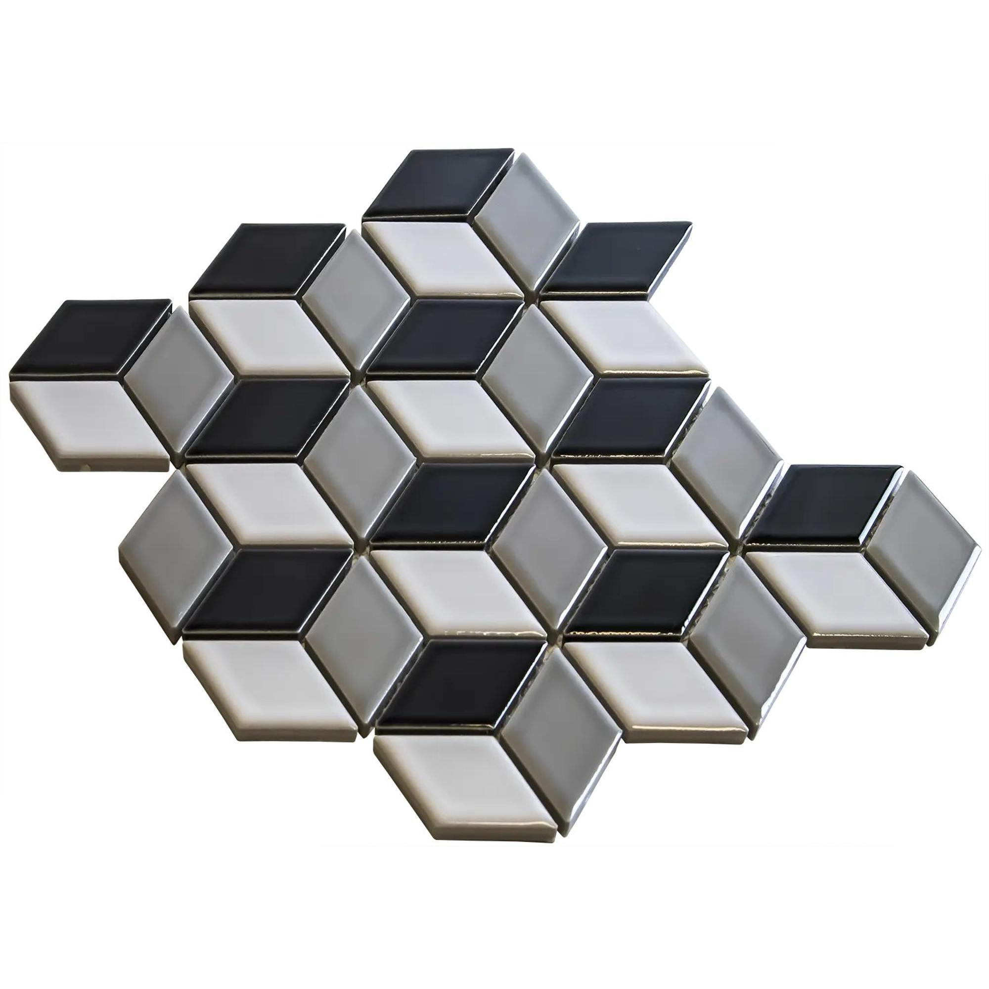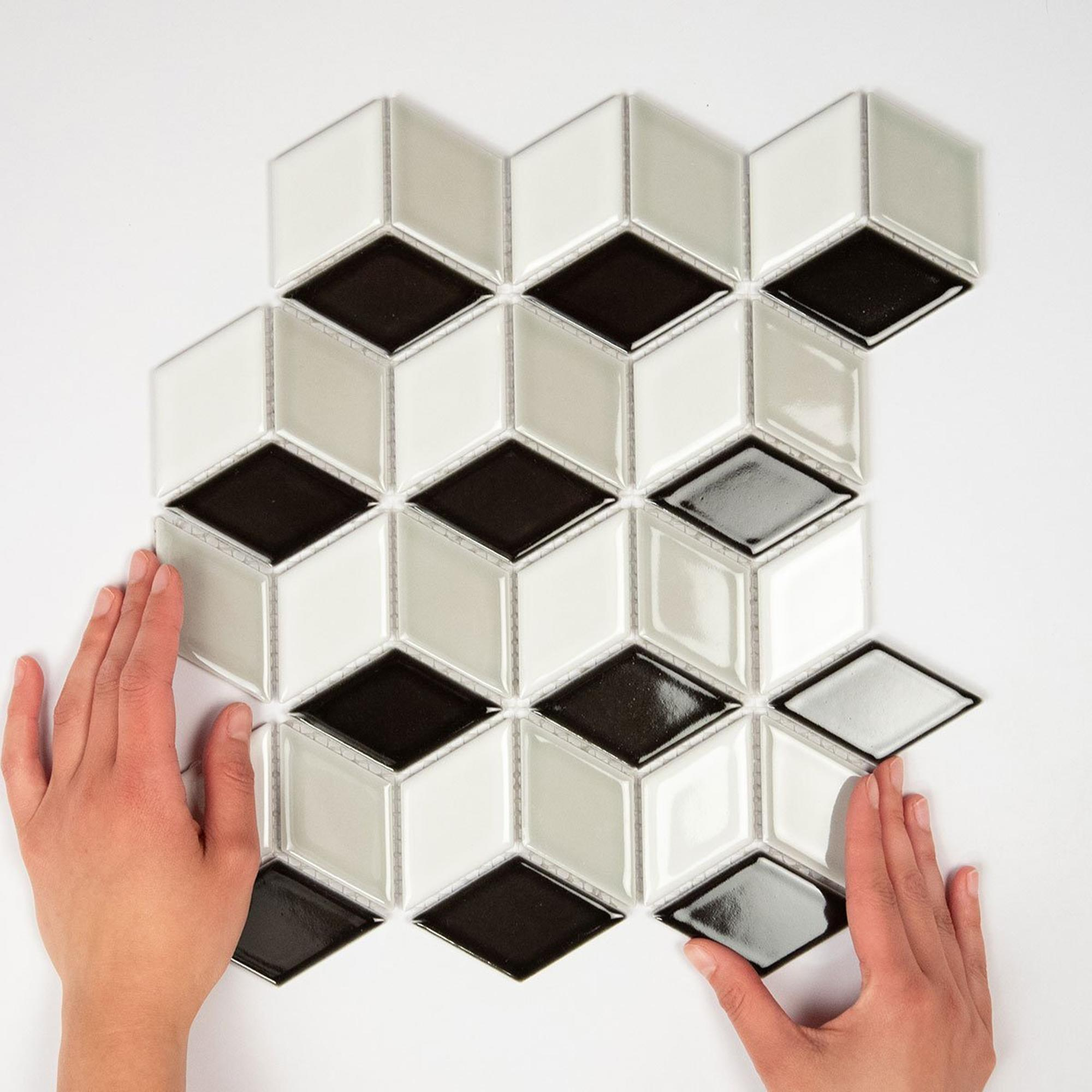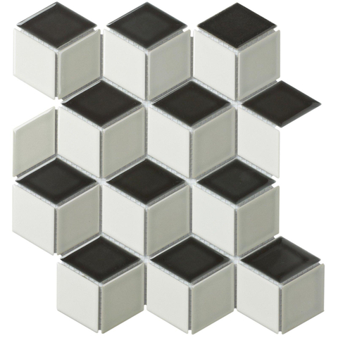 The Mosaic Factory Paris 3D cubic is een mozaïektegel van 26.6x30.5cm (tegelmaat). De mozaïektegels zelf zijn 4.8x8.1x0.6cm met een voegmaat van 3.5mm. Deze mozaïektegel heeft de kleur: glanzend wit/grijs/zwart.