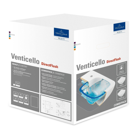 Het Combi-Pack van de collectie Venticello van Villeroy & Boch bestaat uit een wandhangend diepspoelcloset en de bijpassende toiletzitting. Het toilet combineert vorm en functie op indrukwekkende wijze. Met zijn gebogen rondingen past het op harmonieuze wijze in elke badkamer. De open spoelrand in het toilet en de innovatieve waterstroom zorgen voor perfecte spoelresultaten en een hygiënische reiniging. Dankzij het zuinige waterverbruik van 3 of 4,5 liter wordt ook bij elke spoelbeurt kostbaar water bespaard. De meegeleverde smalle toiletzitting overtuigt door de stille automatische sluitfunctie. Speciale scharnieren maken het eenvoudig om de zitting te verwijderen en weer terug te plaatsen, bijvoorbeeld voor een grondige reiniging.
