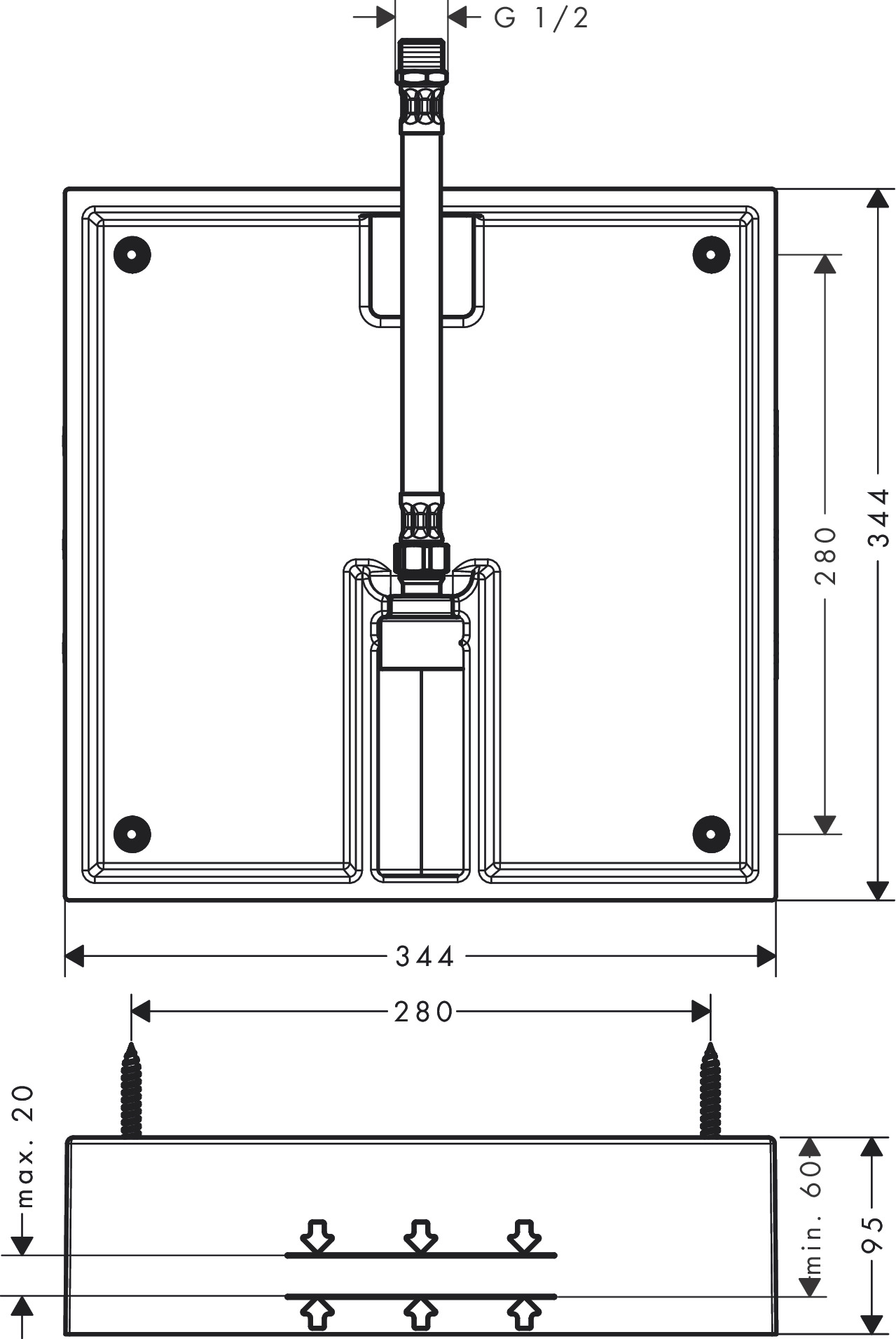 De bewezen kwaliteit van hansgrohe en hoogwaardige materialen zorgen voor blijvend betrouwbare werking. Het inbouwdeel wordt in het plafond geïnstalleerd en dient als bevestiging voor de hoofddouche. De straalplaat ligt na het monteren vlak aan.