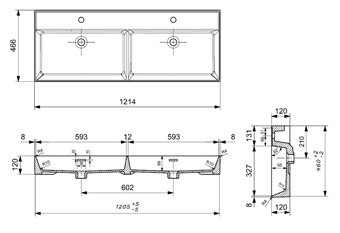 Specificaties Wastafel Dubbel Plieger Kansas 2 Kraangaten 120x46,6 cm met Overloop Wit: