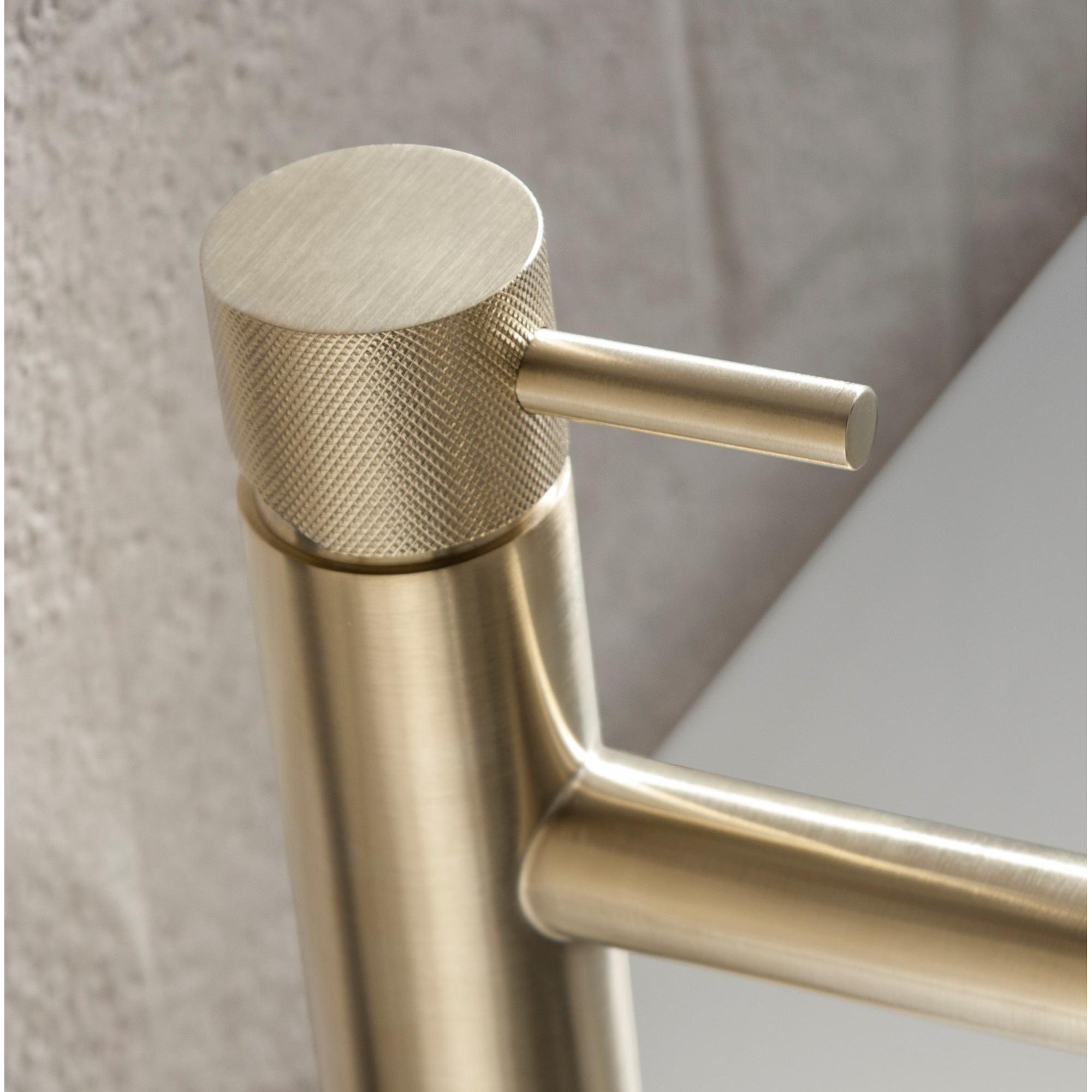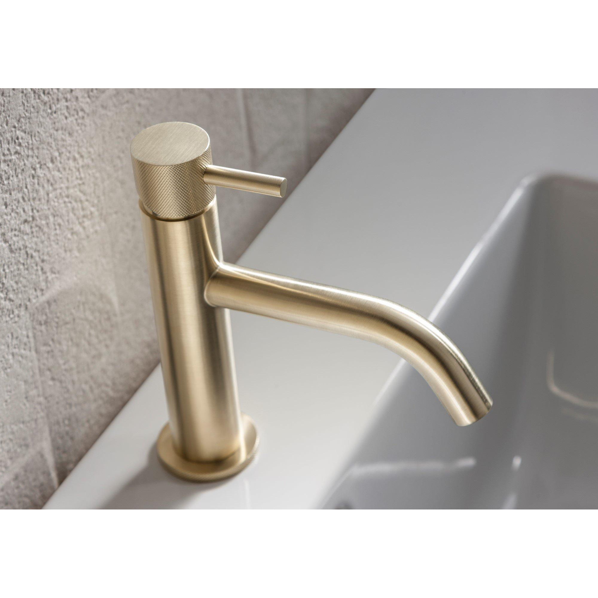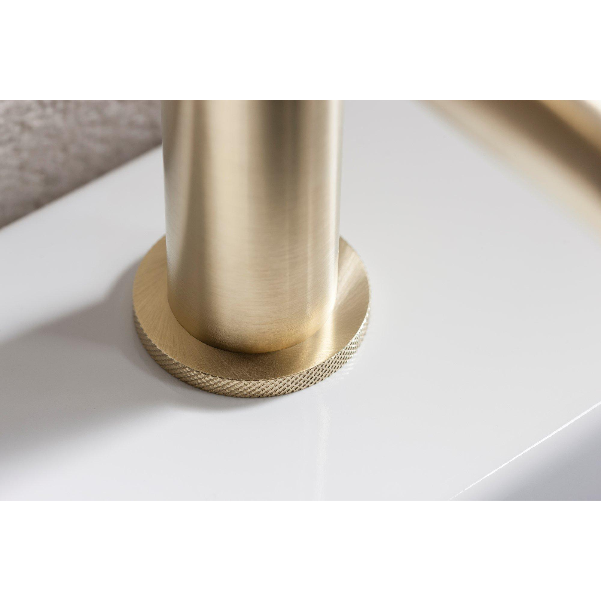 Deze wastafelkraan straalt stijl en klasse uit dankzij het geribbelde ontwerp en de warme messing geborstelde afwerking. Het minimalistische en toch opvallende design past perfect bij een eigentijdse badkamerinrichting. De kraan voegt een vleugje luxe toe aan de wastafel en creëert een verfijnde uitstraling.