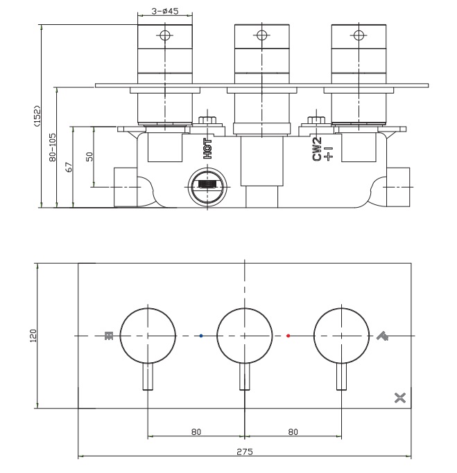 Crosswater MPRO inbouw thermostatisch douchekraan horizontaal 2 stopkranen geborsteld messing