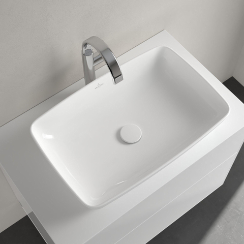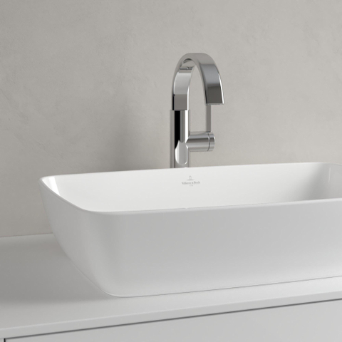 De rechthoekige opzetwastafel uit de collectie Artis van Villeroy & Boch overtuigt met een bijzonder dunne wanddikte en fijne contouren dankzij het innovatieve TitanCeram - een materiaal dat de wastafel ook bij smalle randen bijzonder robuust en stabiel maakt. Ook de diepte van de binnenkom van 10 cm is overtuigend, zodat handen wassen bijzonder comfortabel is en de omliggende wasruimte tegen ongewenste waterspetters wordt beschermd. Dankzij het geecoate, vuilafstotende oppervlak is het schoonmaken echt kinderspel. De moderne matte look is perfect om fraaie designaccenten te creëren. En met de bijpassende meubels uit de collecties Legato of Finion wordt de wastafel een echt highlight in de badkamer.