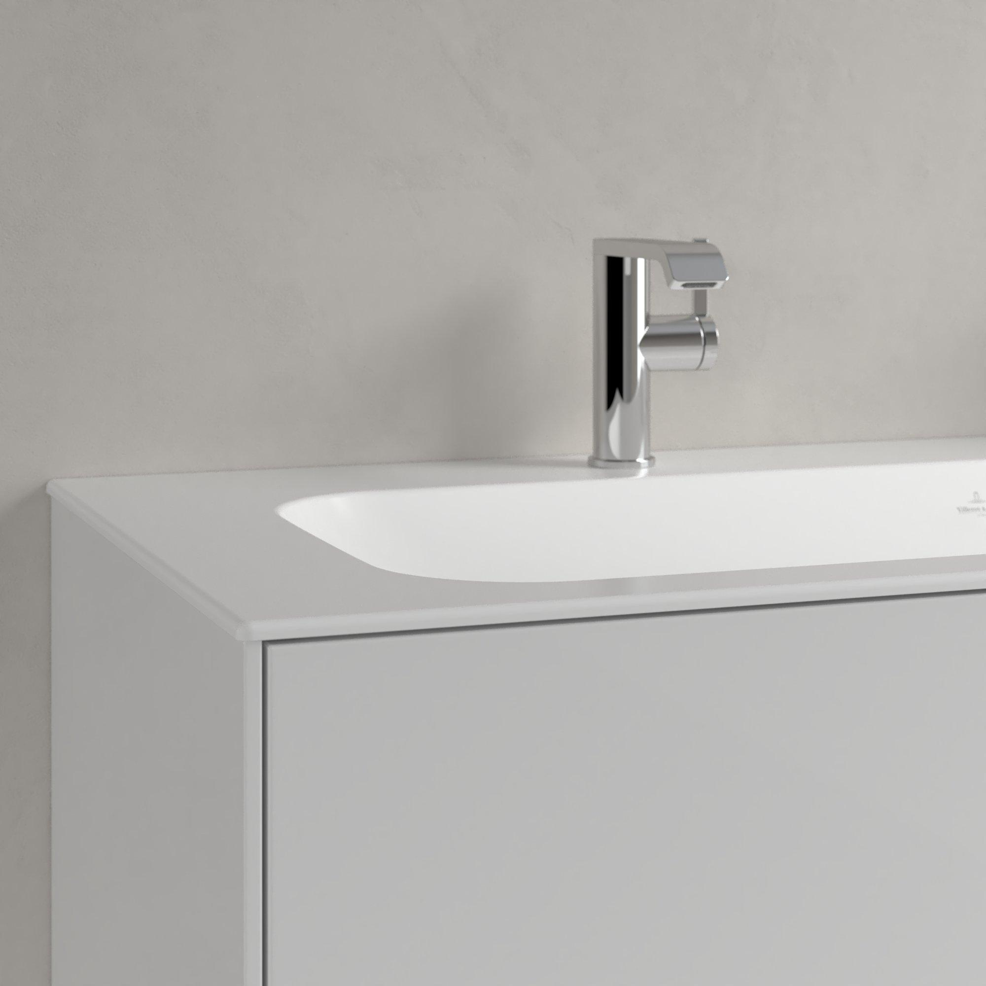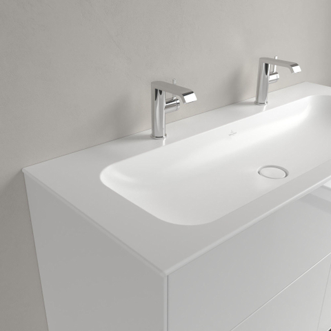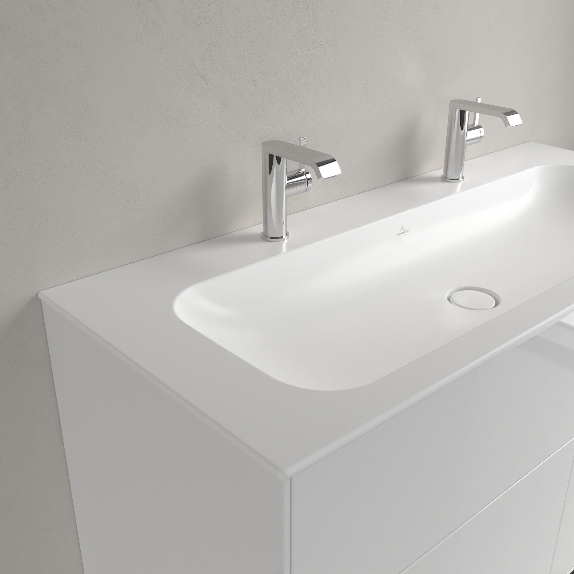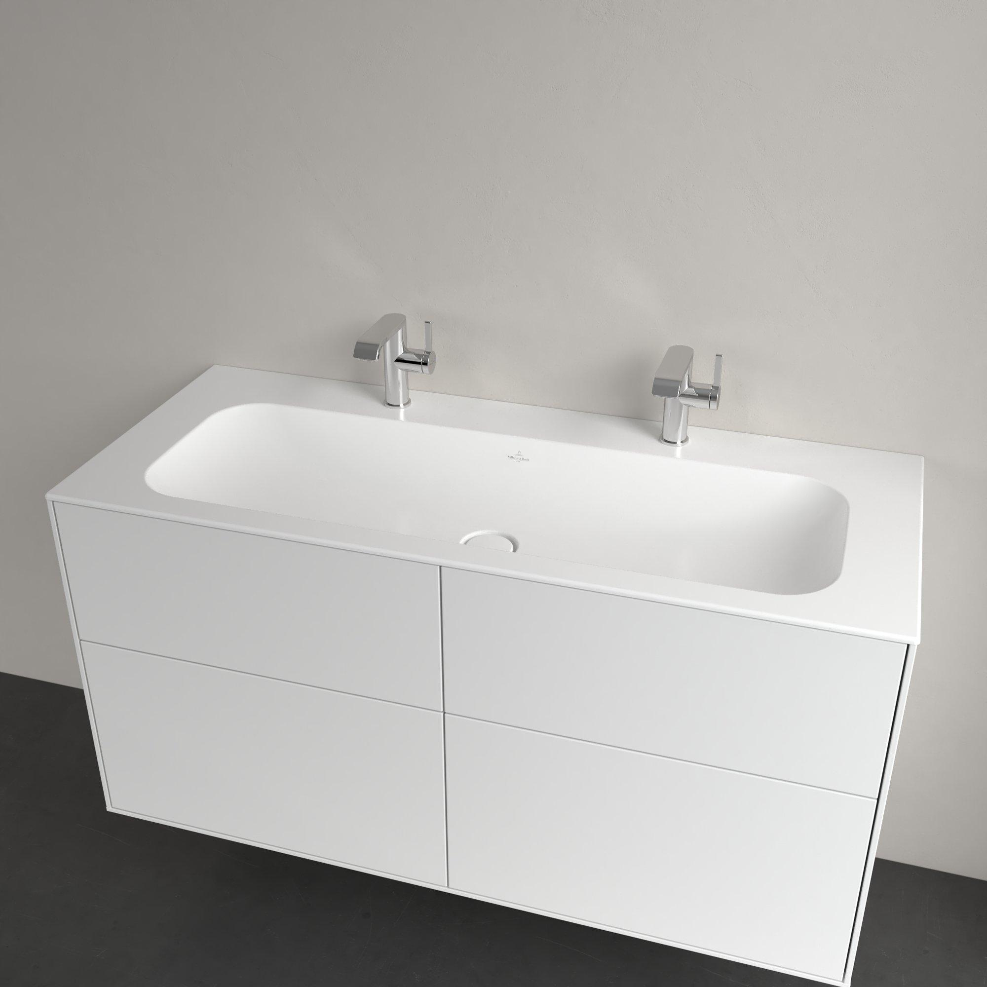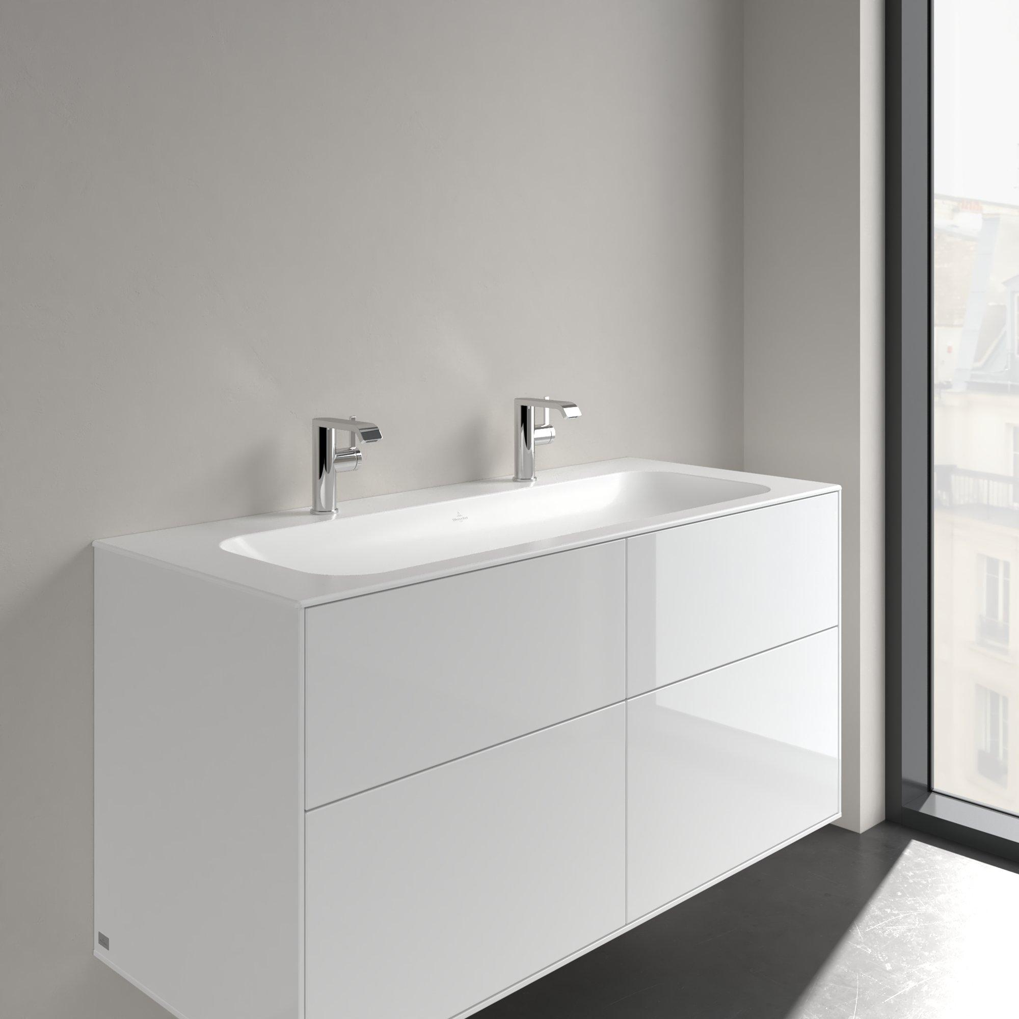 De rechthoekige dubbele meubelwastafel van de collectie Finion van Villeroy & Boch zorgt voor echt comfort in de badkamer. De extreem dunne randen met een uitzonderlijke sterkte kenmerken het filigrane karakter van de wastafel – dit wordt mogelijk gemaakt door het innovatieve materiaal TitanCeram. De vlakke, keramische afvoerplug maakt de elegante look compleet. De wastafel met plaats voor twee kranen overtuigt met een royaal bekken met veel ruimte op de vlakken aan de zijkant voor de belangrijkste badkamerbenodigdheden. Het vuilafstotende oppervlak is een echt voordeel voor wat betreft de hygiëne, voor een snelle en eenvoudige reiniging.