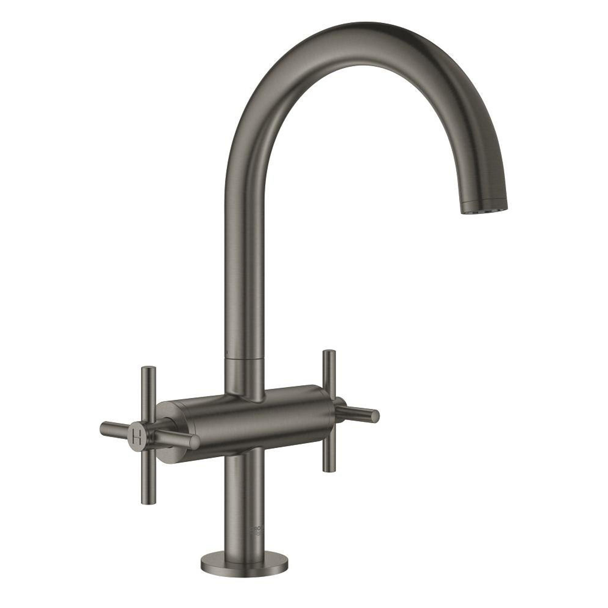 De GROHE Atrio wastafelkraan met twee grepen in geborsteld Hard Graphite – een stijlstatement dat na jarenlang gebruik nog perfect presteert