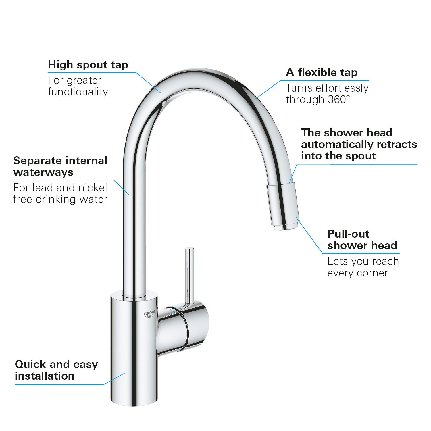 De GROHE Concetto keukenkraan met met uittrekbare sproeikop maakt van keukenklusjes een fluitje van een cent Concetto combineert een chic minimalistisch design met een superieure ergonomische vormgeving; kernwaarden van de Cosmopolitan stijl. De kraan is opgebouwd uit een aantal cilinders en heeft een elegante halfhoge gebogen uitloop. Door de GROHE SilkMove® technologie kun je met één vinger de temperatuur en de waterstroom regelen. En dat alles met een onverslaanbare prijs-kwaliteitverhouding.