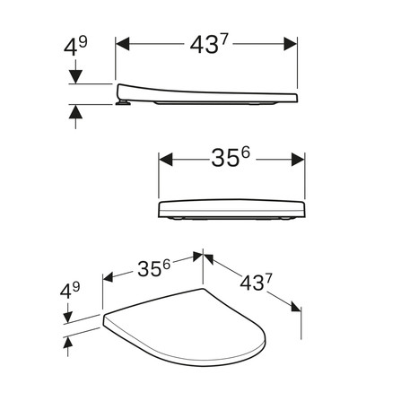 De afmetingen van de zitting zijn: 35,6 cm breed, 45 cm diep en 4,9 cm hoog. De zitting beschikt over verstelbare verchroomde scharnieren, die van bovenaf bevestigd en met een stelschroef vergrendeld kan worden.