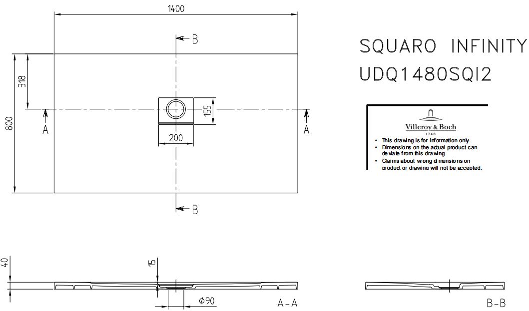 Villeroy & Boch Squaro Infinity kunststof douchebak quaryl rechthoekig 140x80x4cm mat wit SW228353