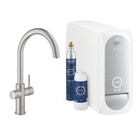 GROHE Blue Home Keukenkraan - C-uitloop - 1-gats - filterfunctie - plat licht en bruisend water - supersteel