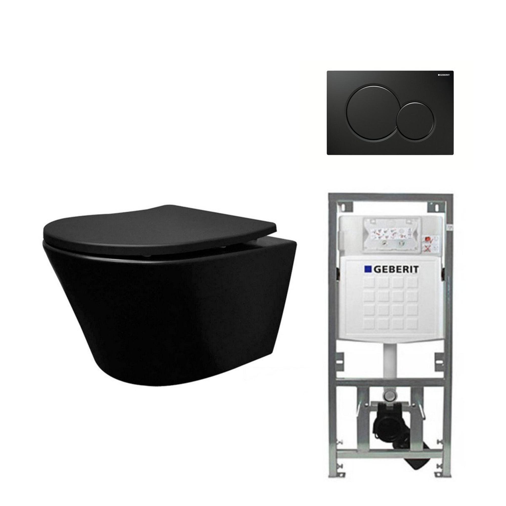 Wiesbaden Vesta toiletset Rimless 52cm mat zwart Geberit inbouwreservoir softclose en quickrelease toiletzitting met bedieningsplaat glans zwart