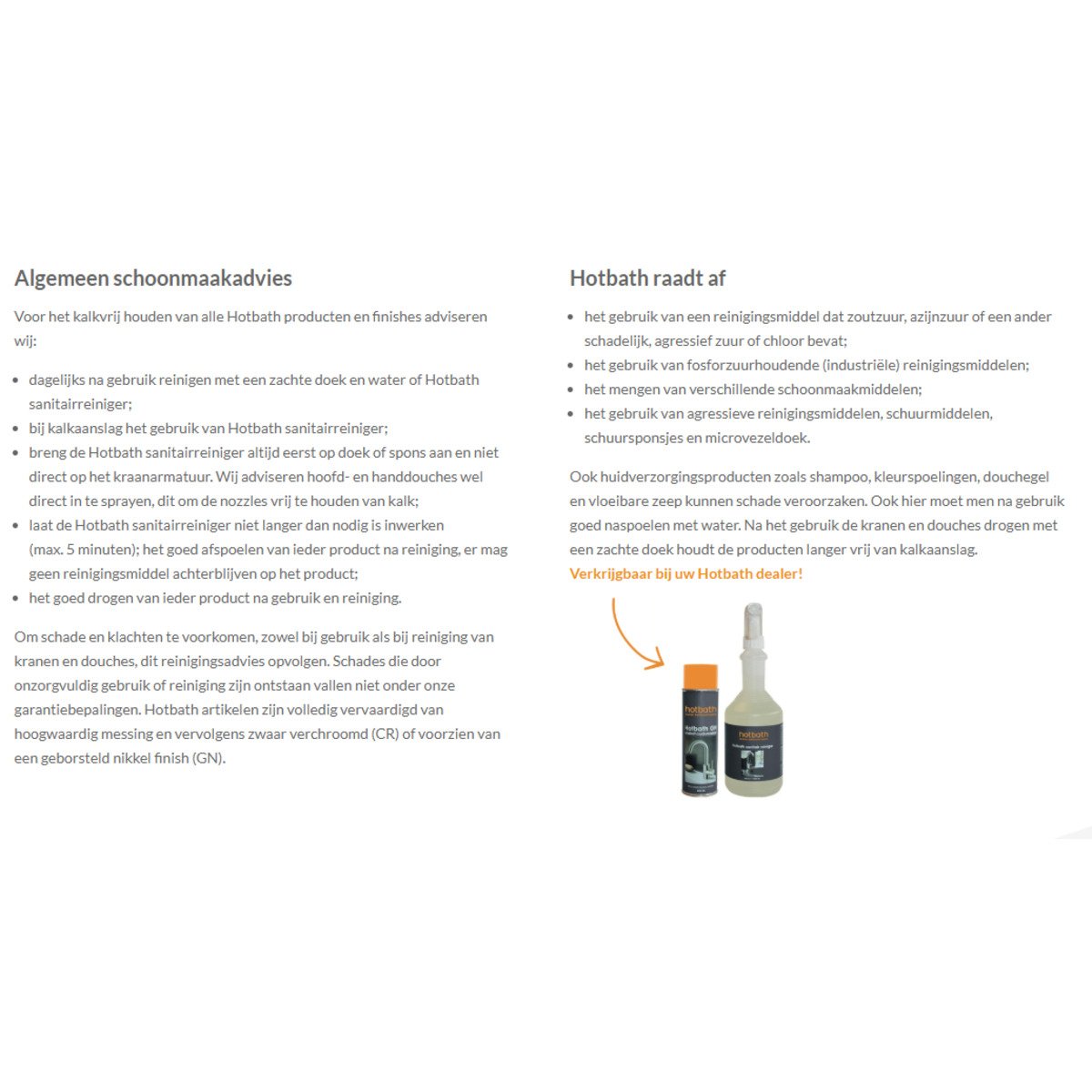 Om schade en klachten te voorkomen, zowel bij gebruik als bij reiniging van kranen en douches, dit reinigingsadvies opvolgen. Schades die door onzorgvuldig gebruik of reiniging zijn ontstaan vallen niet onder onze garantiebepalingen. Hotbath artikelen zijn volledig vervaardigd van hoogwaardig messing en vervolgens zwaar verchroomd (CR) of voorzien van een geborsteld nikkel finish (GN).