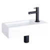 De Differnz Hura fonteinset straalt een moderne uitstraling uit dankzij zijn strakke rechthoekige ontwerp en de trendy zwarte matte rechte kraan. Dit geeft de badkamer of toiletruimte een eigentijdse en luxe uitstraling. Het contrast tussen het zwarte en witte keramiek zorgt voor een elegant en tijdloos design dat de ruimte direct transformeert tot een stijlvolle omgeving.