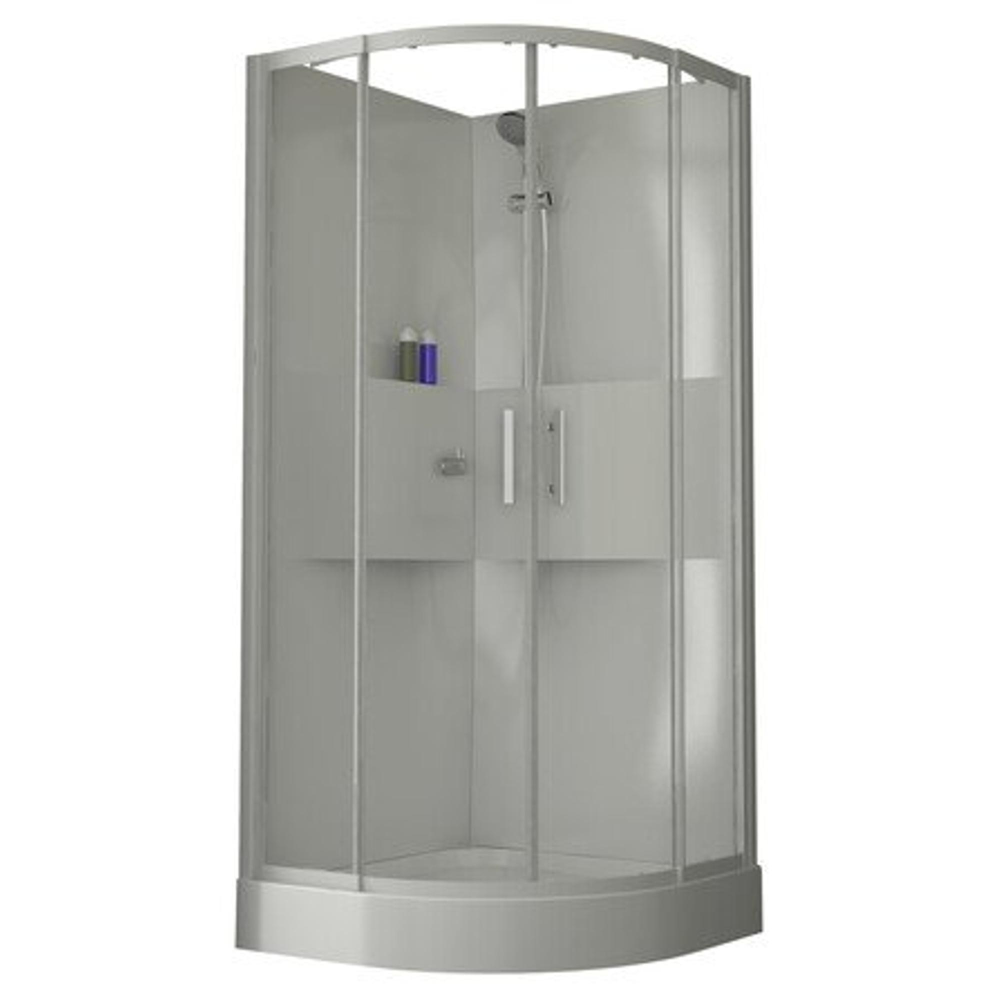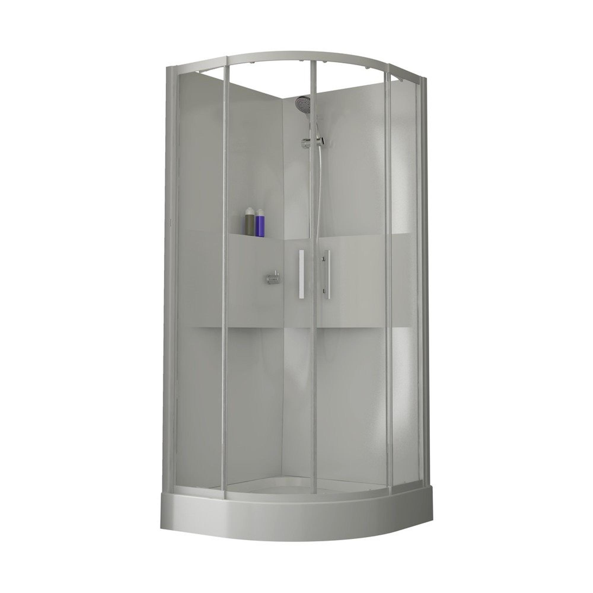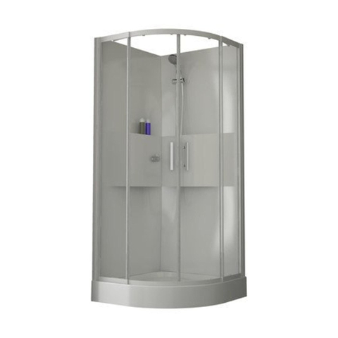 DOUCHECABINE 90 X 90 CM MET HOEKINSTAP KWARTROND Eenvoudig en strak design. Handige tablets voor het gebruik van zeep en shampoo’s. Acryl achterwanden, schuifdeuren, 6 mm veiligheidsglas. Handgrepen in chroom. Profielen wit gelakt. Thermostatische inbouwkraan, handdouche 3 jets op douchestang met gladde flexibel. Achterwanden zijn omkeerbaar.