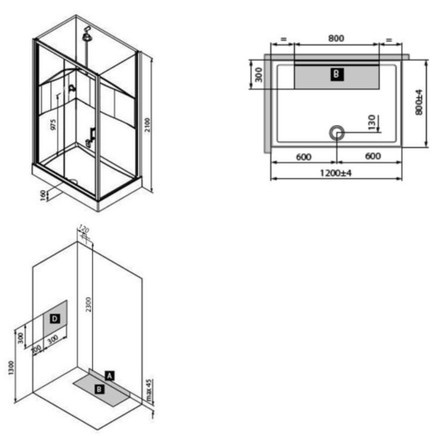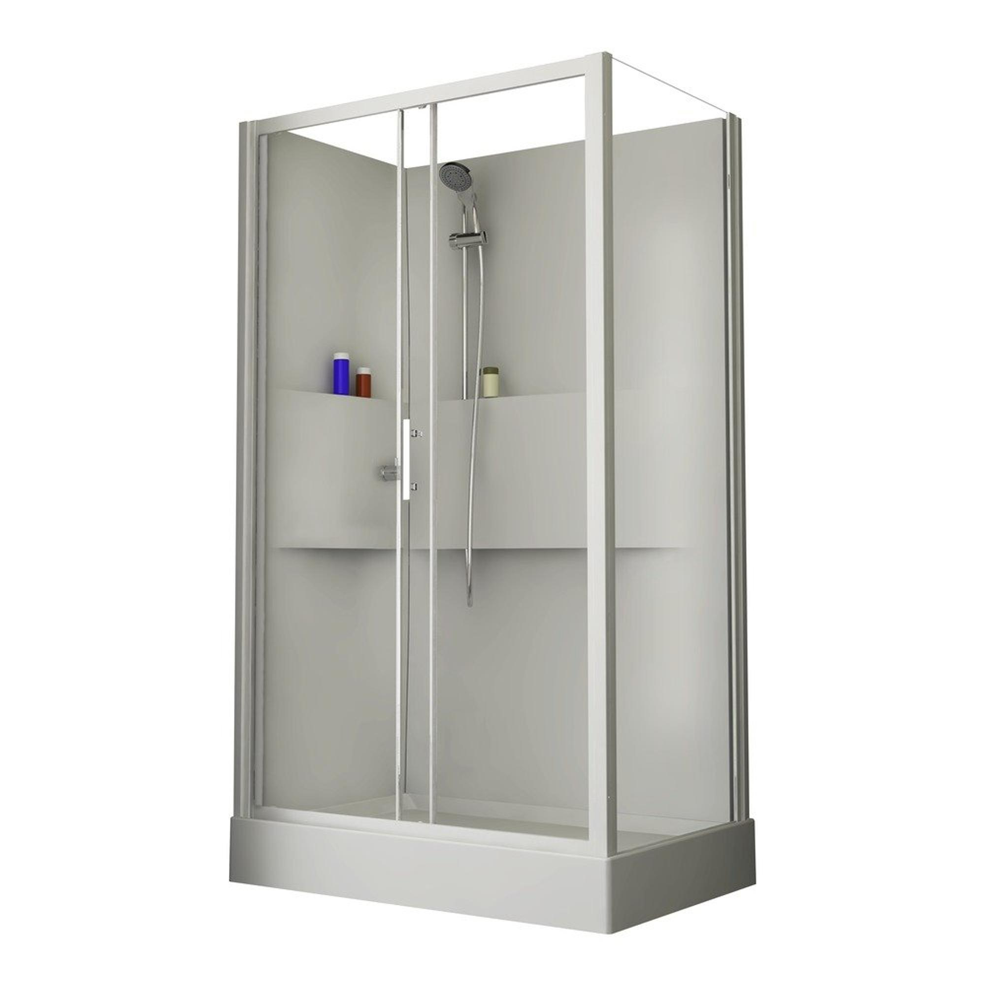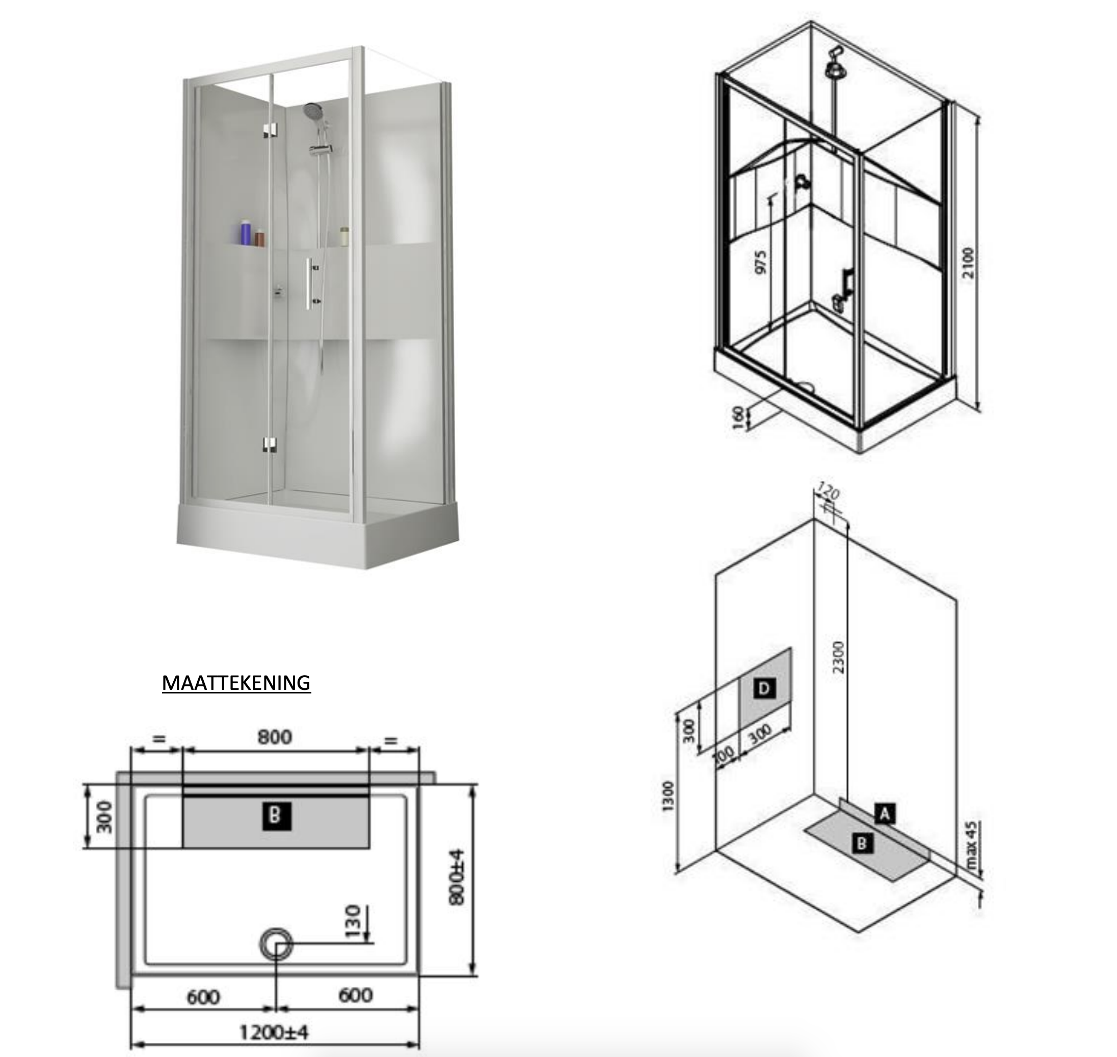 DOUCHECABINE 120 X 80 CM LINKS/RECHTS Eenvoudig en strak design. Handige tablets voor het gebruik van zeep en shampoo’s. Acryl achterwanden, schuifdeur en vaste wand, 6 mm veiligheidsglas. Handgreep in chroom. Profielen wit gelakt. Thermostatische inbouwkraan, handdouche 3 jets op douchestang met gladde flexibel. Achterwanden zijn omkeerbaar.