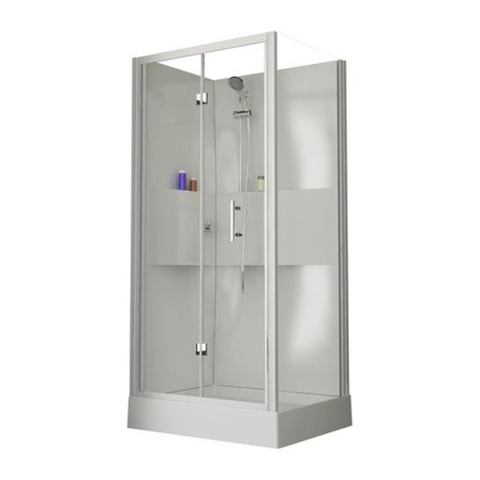 DOUCHECABINE 100 X 80 CM LINKS/RECHTS Eenvoudig en strak design. Handige tablets voor het gebruik van zeep en shampoo’s. Acryl achterwanden, plooideur en vaste wand, 6 mm veiligheidsglas. Handgreep en scharnieren in chroom. Profielen wit gelakt. Thermostatische inbouwkraan, handdouche 3 jets op douchestang met gladde flexibel. Achterwanden zijn omkeerbaar.