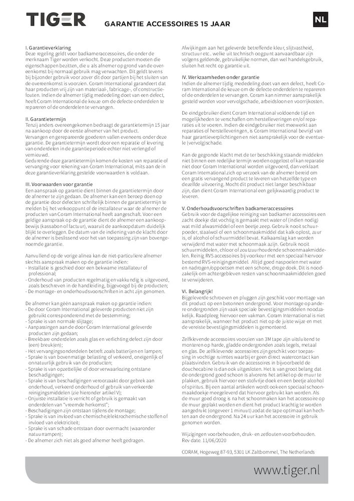 Alle Tiger producten zijn uitvoerig getest. Niets laten ze aan het toeval over. Wat ze leveren moet namelijk goed zijn. Als er toch iets mis is met je Tiger product, kun je dus op Tiger rekenen. De garantietermijn van een Tiger product vind je achterop de verpakking. Op badkamermeubilair en douchecabines van Tiger heb je steevast 3 jaar garantie, op accessoires en kranen 5 jaar en toiletzittingen 2 jaar.