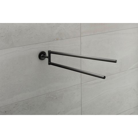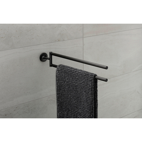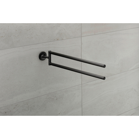 De Duravit Starck T Handdoekhouder is ontworpen met multifunctionaliteit in gedachten. De twee stangen bieden voldoende ruimte om meerdere handdoeken op te hangen, waardoor je badkamer netjes en georganiseerd blijft. De draaibare functie maakt het gemakkelijk om de handdoeken te bereiken en te drogen, terwijl het zwarte matte afwerking een vleugje luxe toevoegt aan de ruimte.