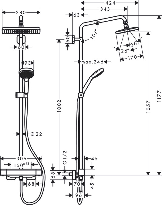 Met de Croma E 280 1jet Showerpipe EcoSmart tover je de douche om tot een weldadige oase voor jong en oud. In deze showerpipe is alle ervaring van hansgrohe voor waterbesparend en zorgeloos doucheplezier verwerkt.