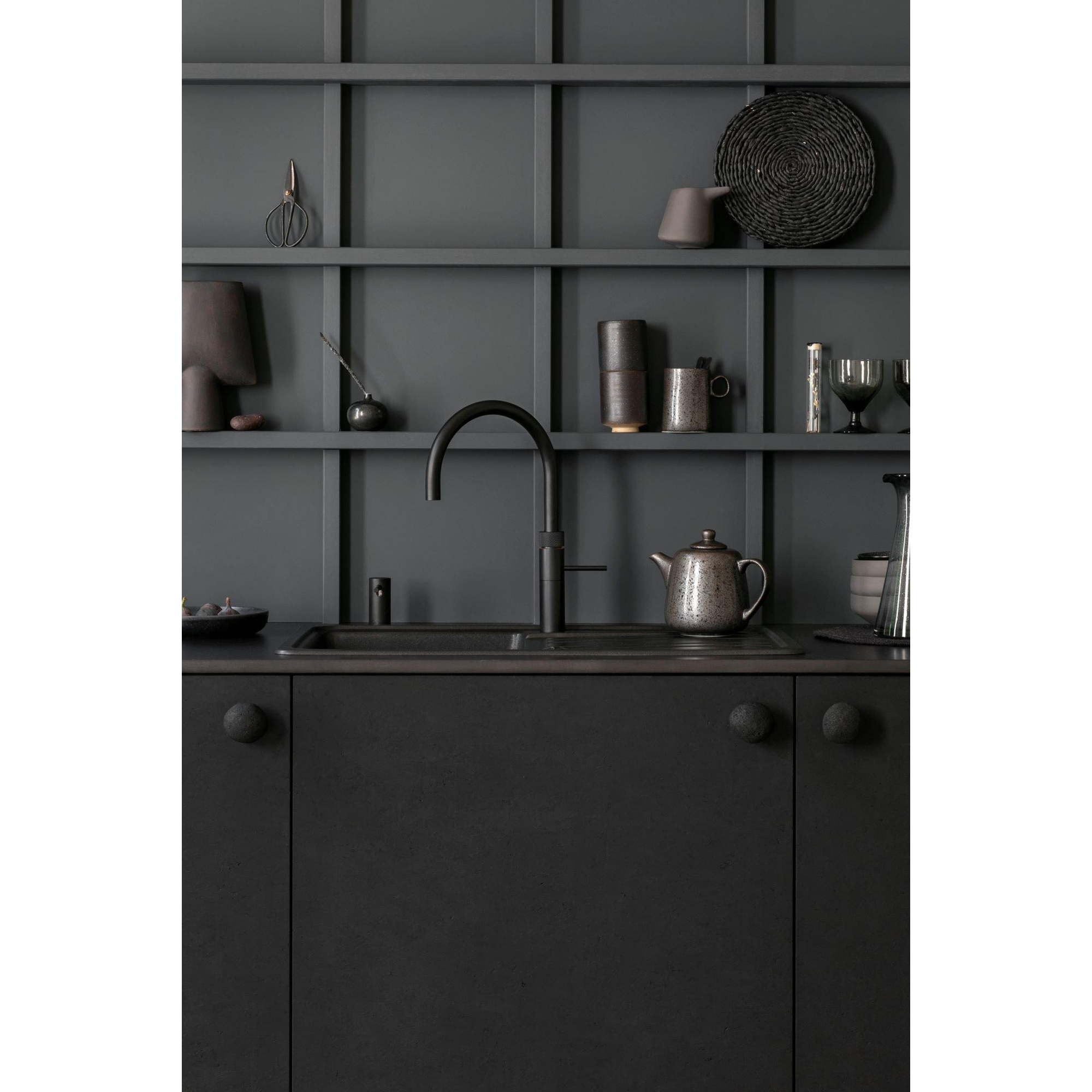 De Quooker Fusion Round kokendwaterkraan straalt elegantie en stijl uit in elke keuken. De ronde vormen en zwarte afwerking geven een luxe uitstraling aan het geheel. Het ontwerp is zorgvuldig doordacht om naadloos op te gaan in verschillende keukenstijlen, van modern tot klassiek. Deze kraan is niet alleen een functioneel apparaat, maar ook een decoratief element dat de uitstraling van jouw keuken naar een hoger niveau tilt.