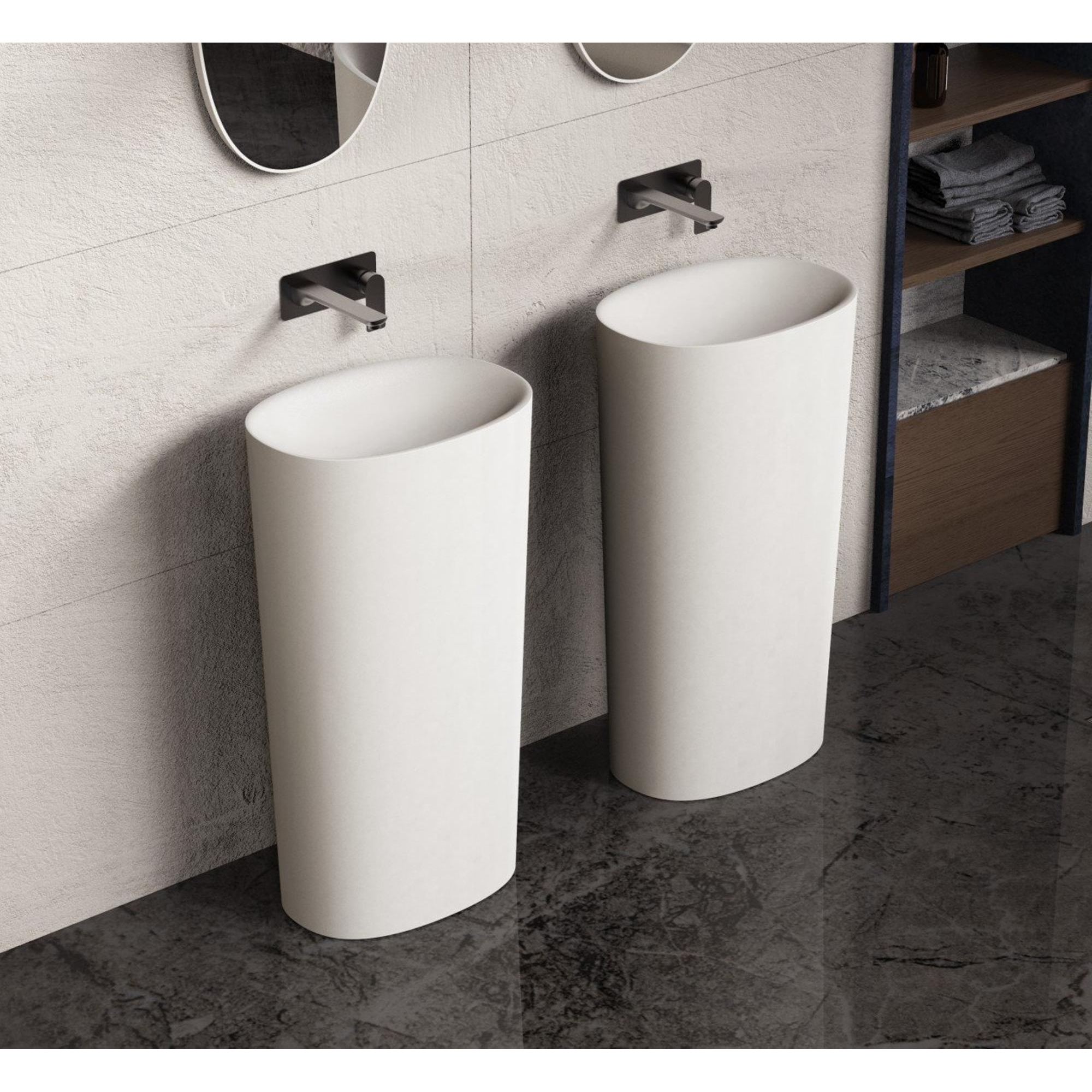 De wastafel heeft een afmeting van 50x35x90 cm en staat stevig op de vloer. Dankzij de matte, fluweelachtige afwerking voelt het oppervlak prettig aan en draagt het bij aan de luxe uitstraling. De wastafel beschikt over een geïntegreerd afvoergat, maar heeft geen kraangat, wat hem ideaal maakt voor gebruik met een inbouwkraan.