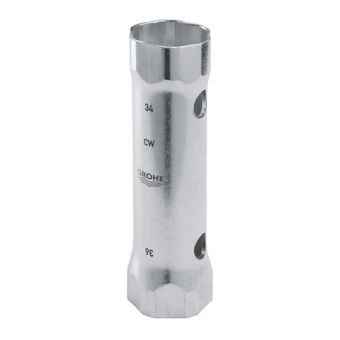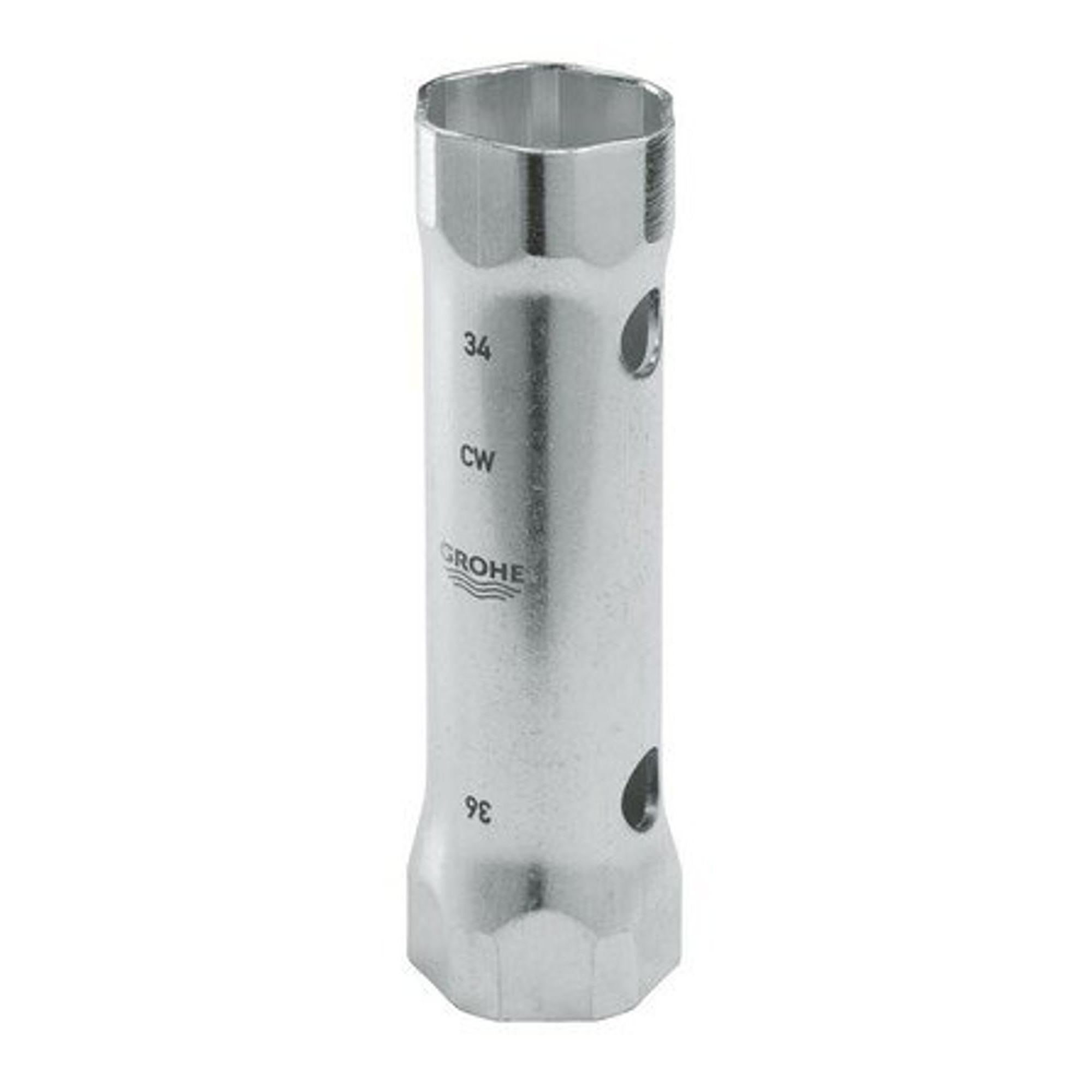 De GROHE pijpsleutel is een essentieel gereedschap voor de montage en demontage van verschillende GROHE-cartridges en bevestigingsmoeren. Met twee verschillende sleutelgroottes van 36 mm en 34 mm is deze pijpsleutel veelzijdig inzetbaar en ideaal voor zowel professionele installateurs als doe-het-zelvers.
