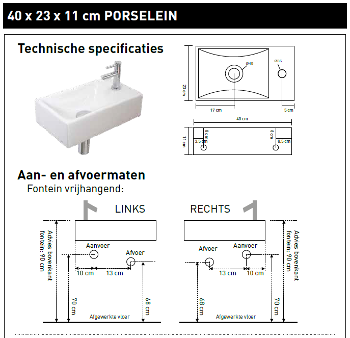 INK Fonteinpack - porselein - kraangat links - fonteinkraan - designsifon - afvoerplug - incl bevestiging