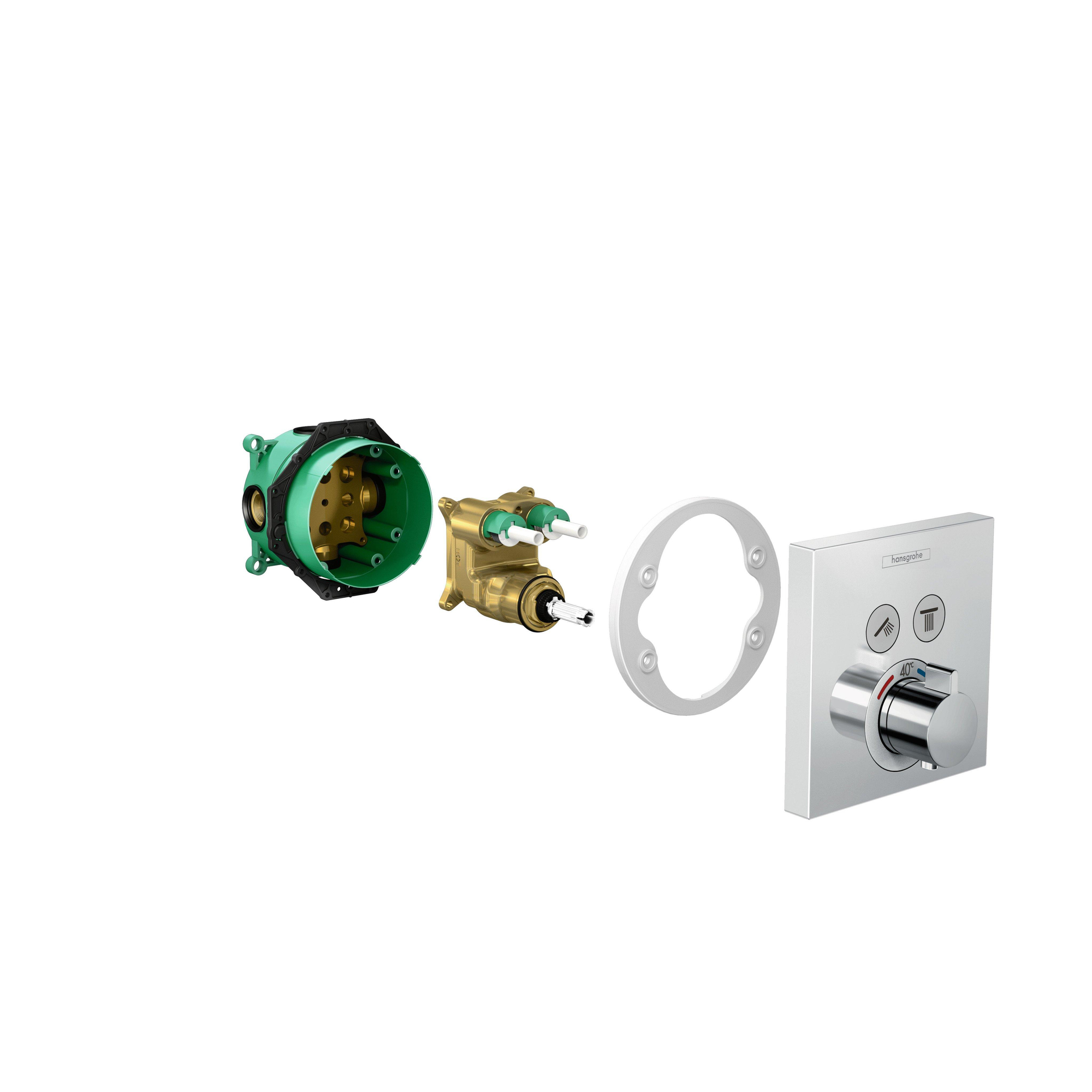 De ShowerSelect inbouwthermostaat voor 2 functies in Polished Gold-Optic van hansgrohe combineert vorm, functionaliteit en kleur op een fascinerende manier. Het tijdloze design wordt gekenmerkt door zijn geometrische vormtaal. Door zijn duurzame, hoogglans finish in gepolijste goud-look is de thermostaat een luxe designstatement onder de douche. Beide functies - bijvoorbeeld een hoofd- of handdouche - worden eenvoudig en snel met een druk op de knop bediend (Select). Voordeel van een inbouwinstallatie: meer ruimte voor design, handige functies en bewegingsvrijheid onder de douche. Voor de installatie is het inbouwdeel hansgrohe iBox Universal nodig (01800180). Ontworpen voor hoge doorstroomhoeveelheden van 25 resp. 23 l/min (bij 3 bar) zorgt de douchethermostaat voor geweldig doucheplezier.