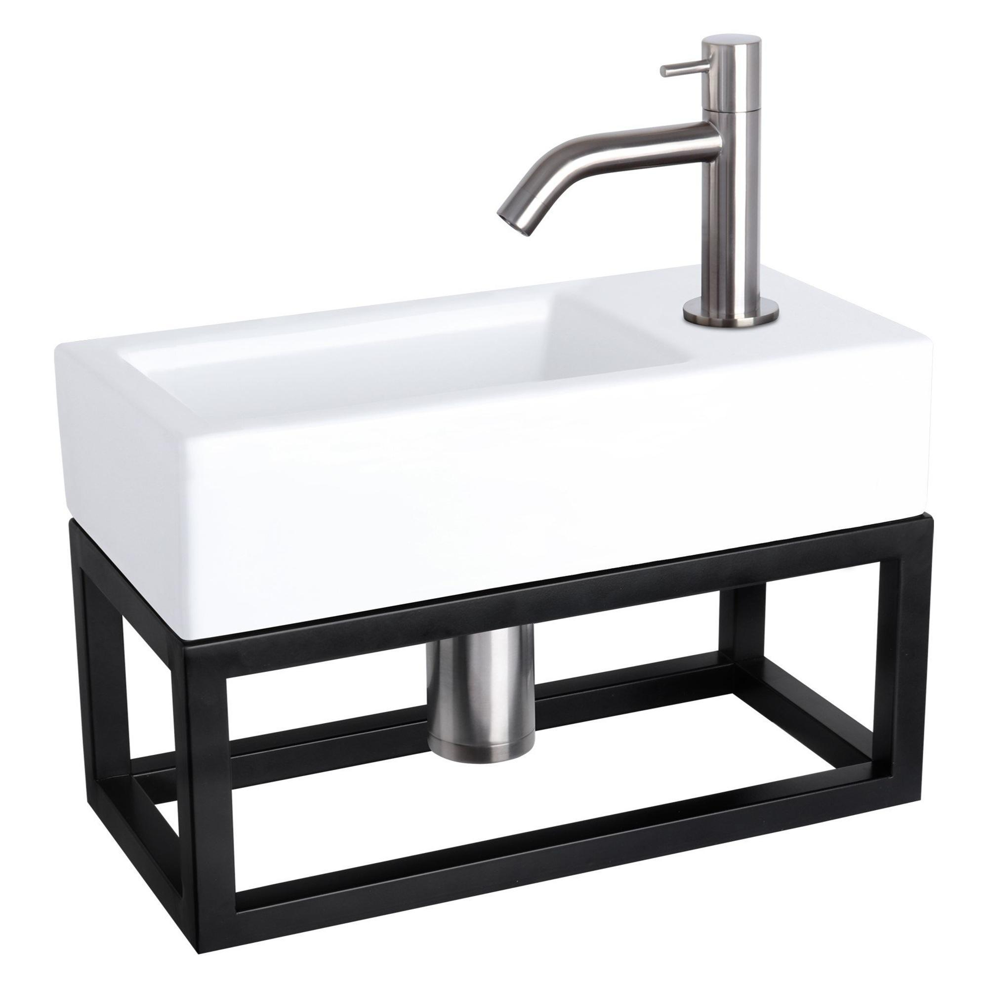 De Differnz Ravo fonteinset is een prachtige toevoeging aan elke badkamer. Met zijn elegante rechthoekige vorm, gebogen matte chromen kraan en strak zwart frame straalt dit fonteinset klasse en stijl uit. De keramiek witte afwerking geeft een frisse en moderne uitstraling, waardoor het een blikvanger wordt in jouw badkamer.
