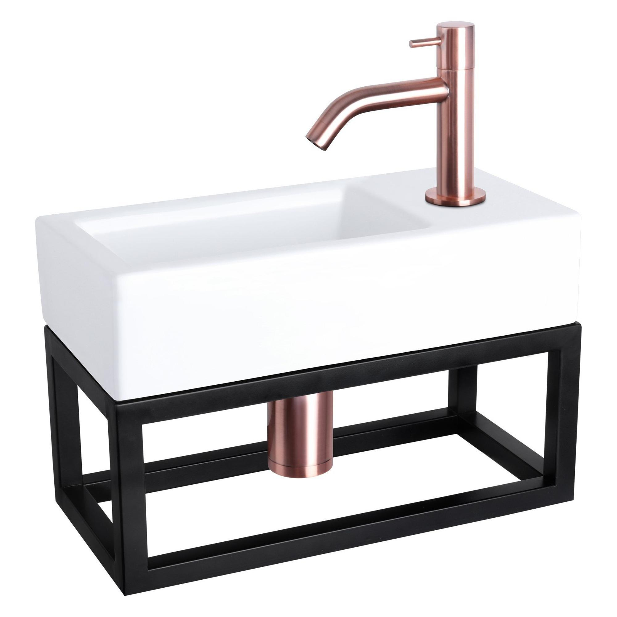 De Differnz Ravo fonteinset straalt stijl en elegantie uit. Met zijn rechthoekige vorm, gebogen koperen kraan en zwart frame, is dit fonteinset een blikvanger in elke badkamer. De combinatie van wit keramiek met de zwarte accenten zorgt voor een moderne en luxe uitstraling.