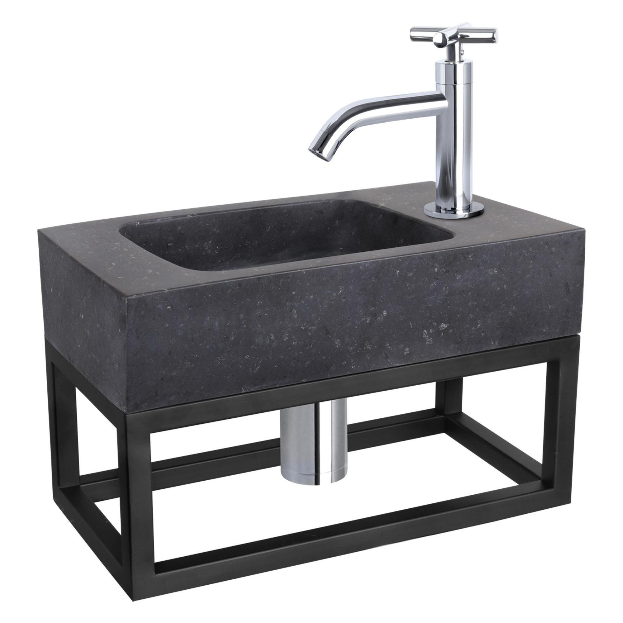 Differnz Bombai fonteinset - 40x22x9cm - Rechthoek - 1 kraangat - Gebogen chromen kraan - met zwart frame - kruisgreep - Natuursteen Zwart