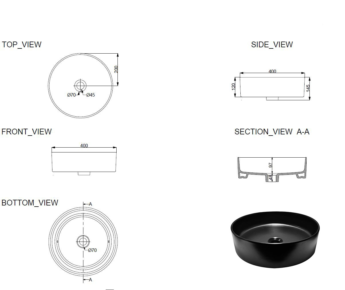 Wiesbaden Link waskom rond 40x12 cm keramiek mat zwart