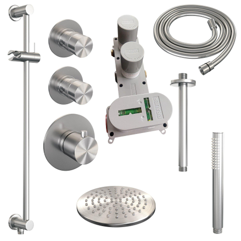 Brauer Brushed Edition Regendoucheset inbouw - hoofddouche 20cm - plafondarm - 3 gladde knoppen - handdouche staaf 1 stand - PVD - geborsteld - RVS