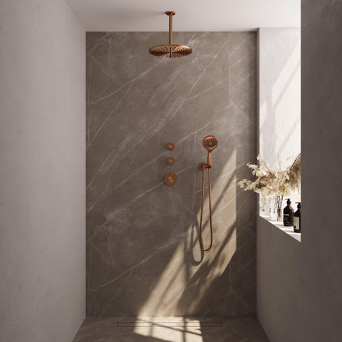 Met zijn geborsteld koperen afwerking is deze doucheset een stijlvolle toevoeging aan elke badkamer. De strakke lijnen en moderne uitstraling passen perfect bij een eigentijdse inrichting. De plafondarm zorgt voor een naadloze integratie in het interieur, terwijl de gladde knoppen een elegante touch toevoegen aan het geheel.