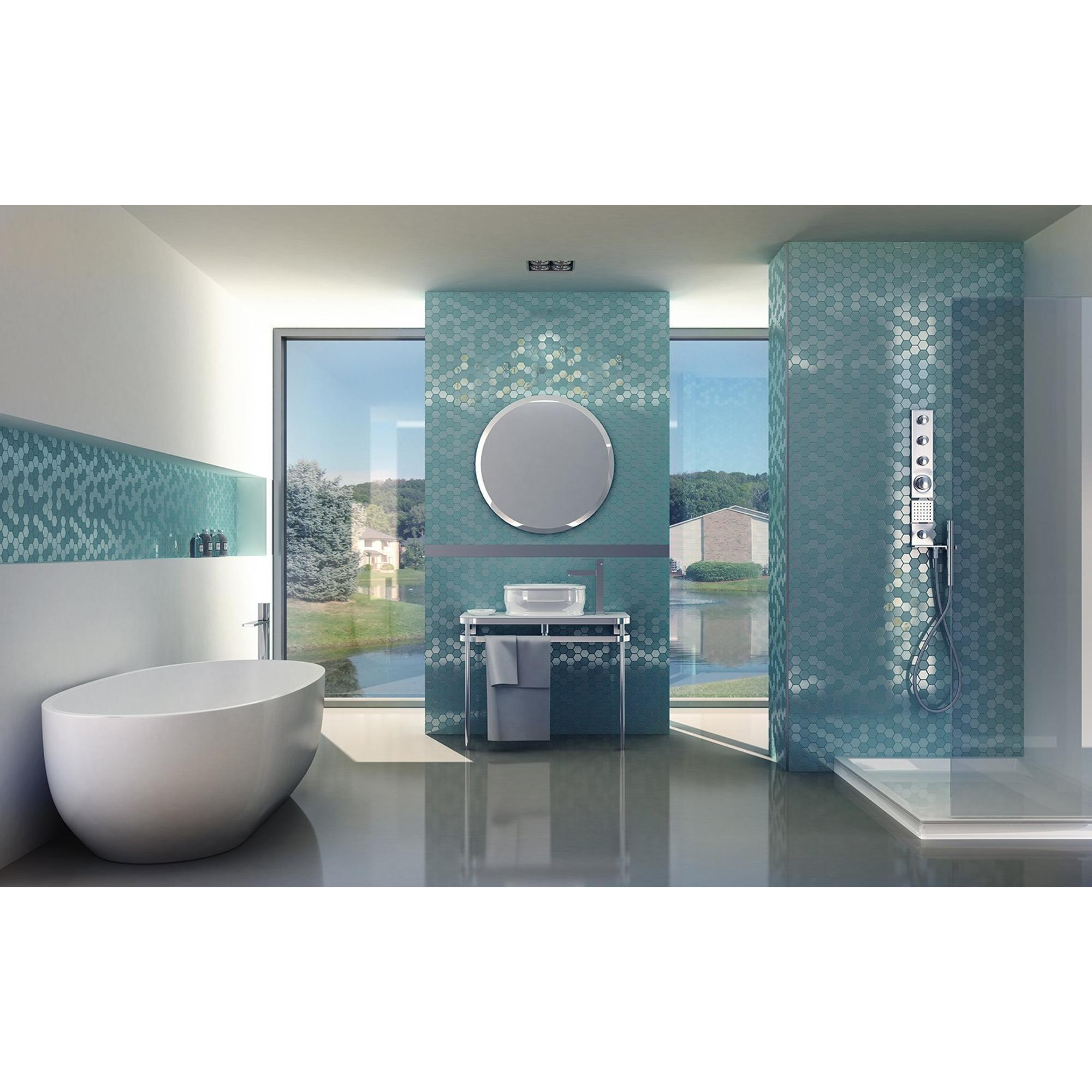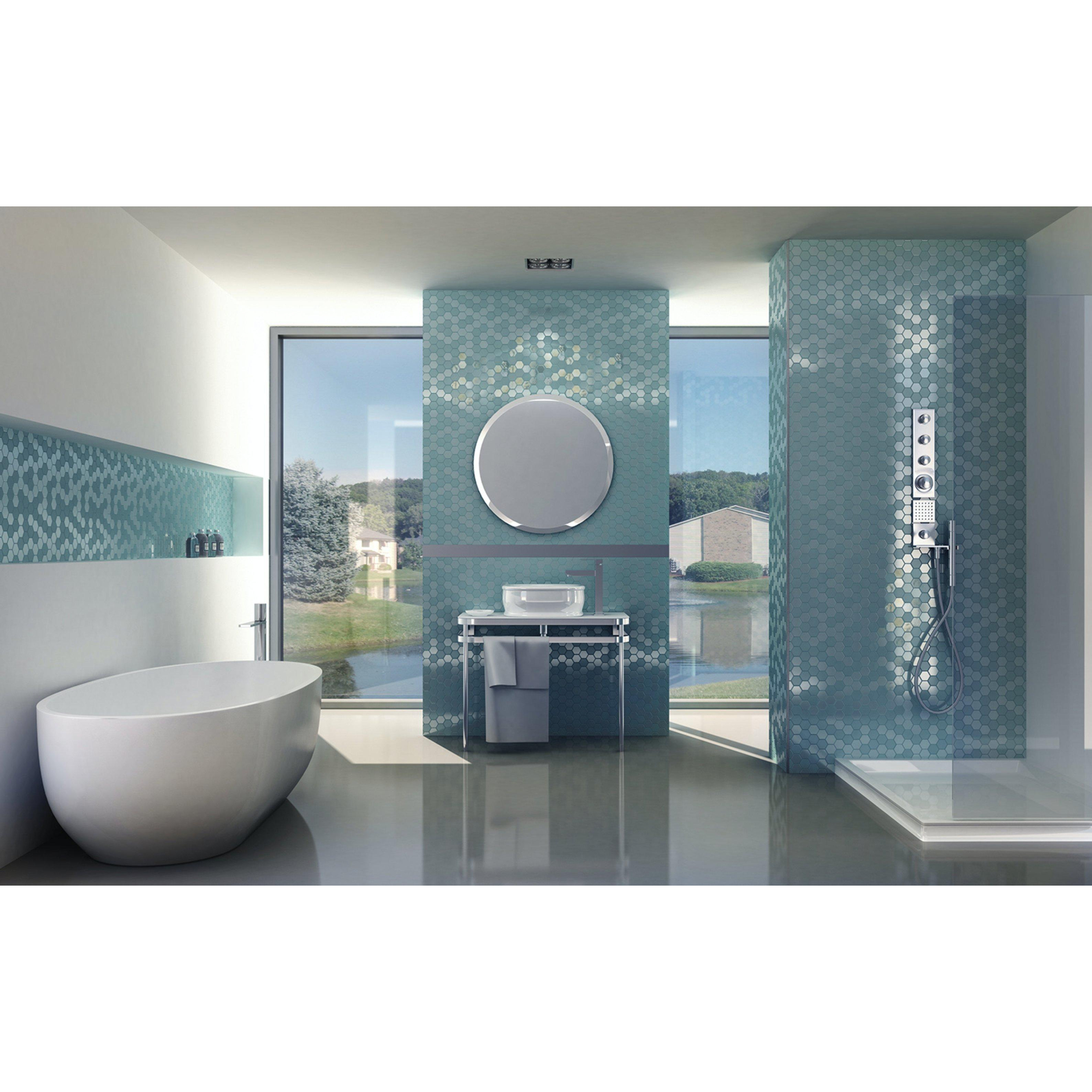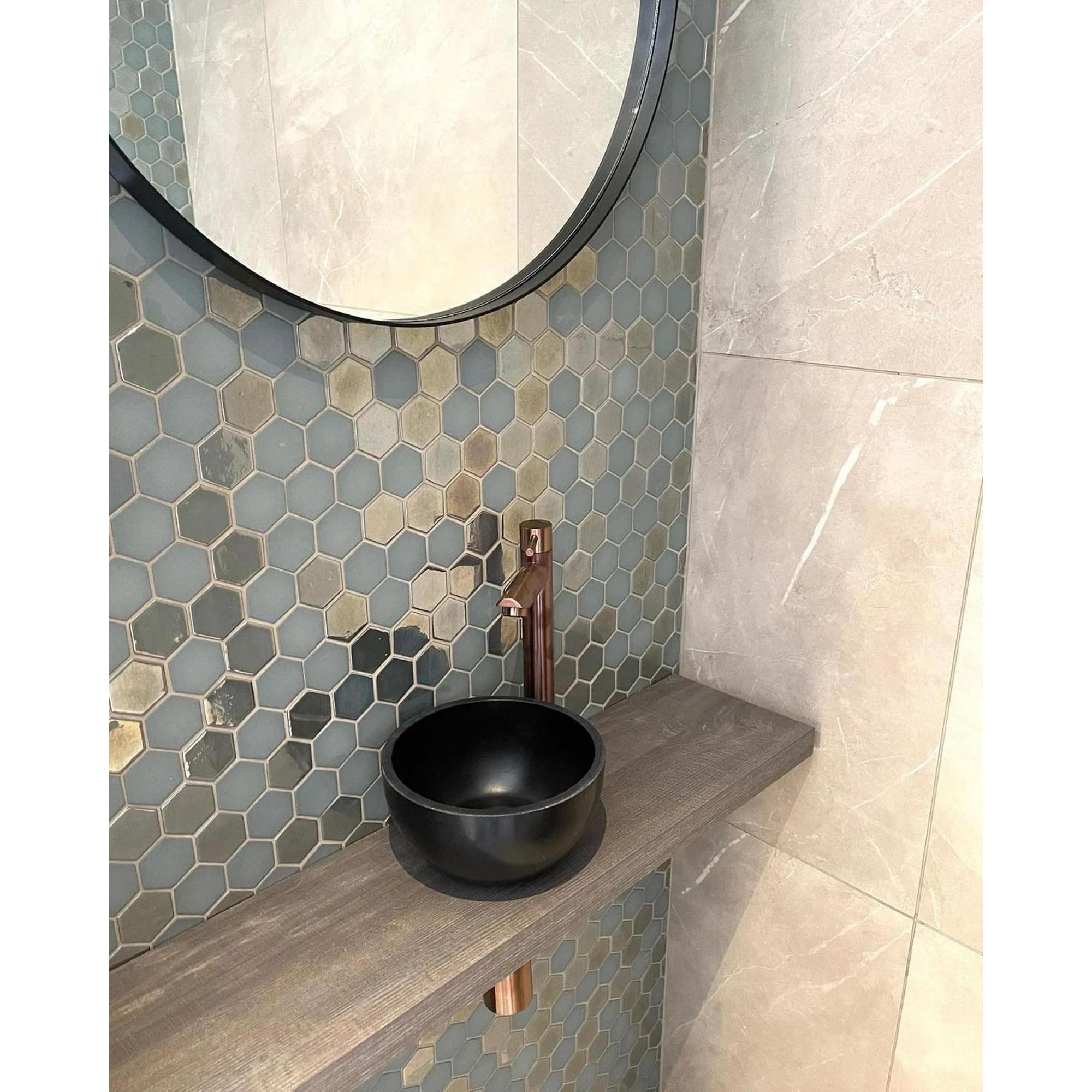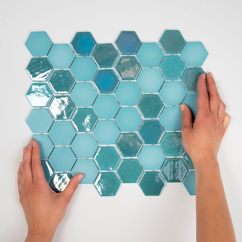 De Mosaic Factory Valencia mozaïektegel straalt een verfijnde uitstraling uit die elke ruimte transformeert in een oase van luxe. De combinatie van mat en glans in de turquoise afwerking zorgt voor een subtiel spel van licht en textuur, waardoor een elegante en tijdloze sfeer ontstaat. De zeshoekige vorm voegt een speels element toe aan het ontwerp, terwijl het gerecyclede glas bijdraagt aan een milieuvriendelijke keuze.