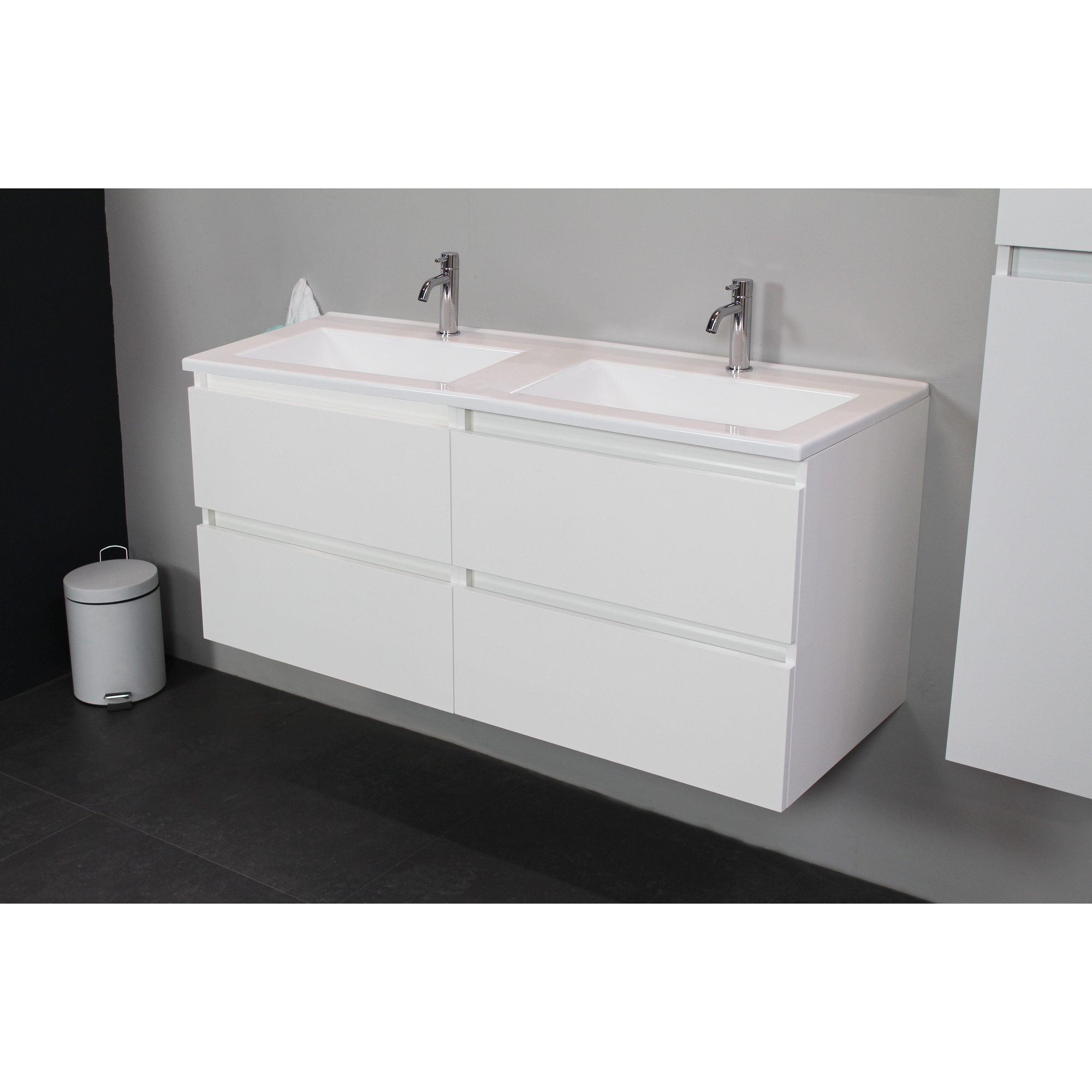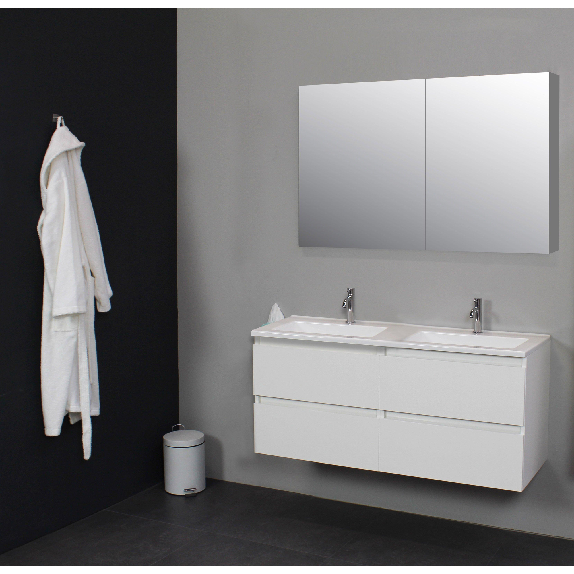 Basic Bella Badkamermeubelset - 120x55x46cm - 2 wasbakken - Acryl - Wit - 2 kraangaten - Spiegelkast zonder verlichting - Melamine Wit hoogglans