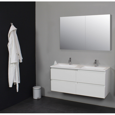 Basic Line Bella Badkamermeubelset - 120x55x46cm - 2 wasbakken - Acryl - Wit - 2 kraangaten - Spiegelkast zonder verlichting - Melamine Wit hoogglans