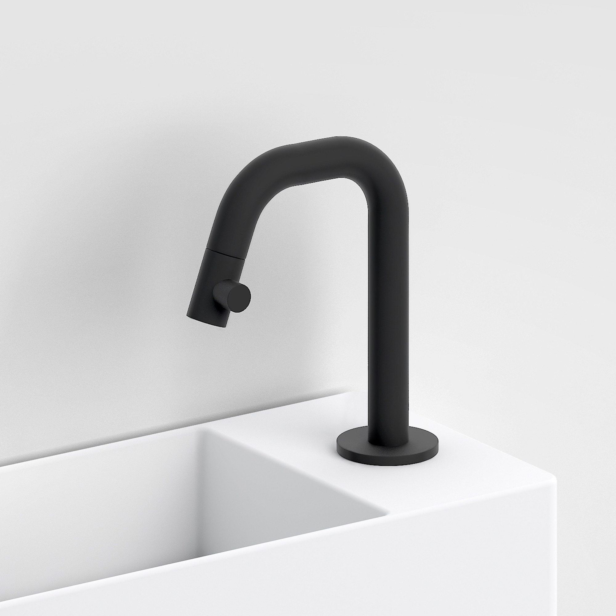 Deze zwarte fonteinkraan uit de Kaldur serie van Clou is een echte eyecatcher in de toiletruimte. De strakke vormgeving past bij vrijwel iedere stijl. Leuk in combinatie met een witte wastafel zodat de mat zwarte kleur goed tot zijn recht komt.