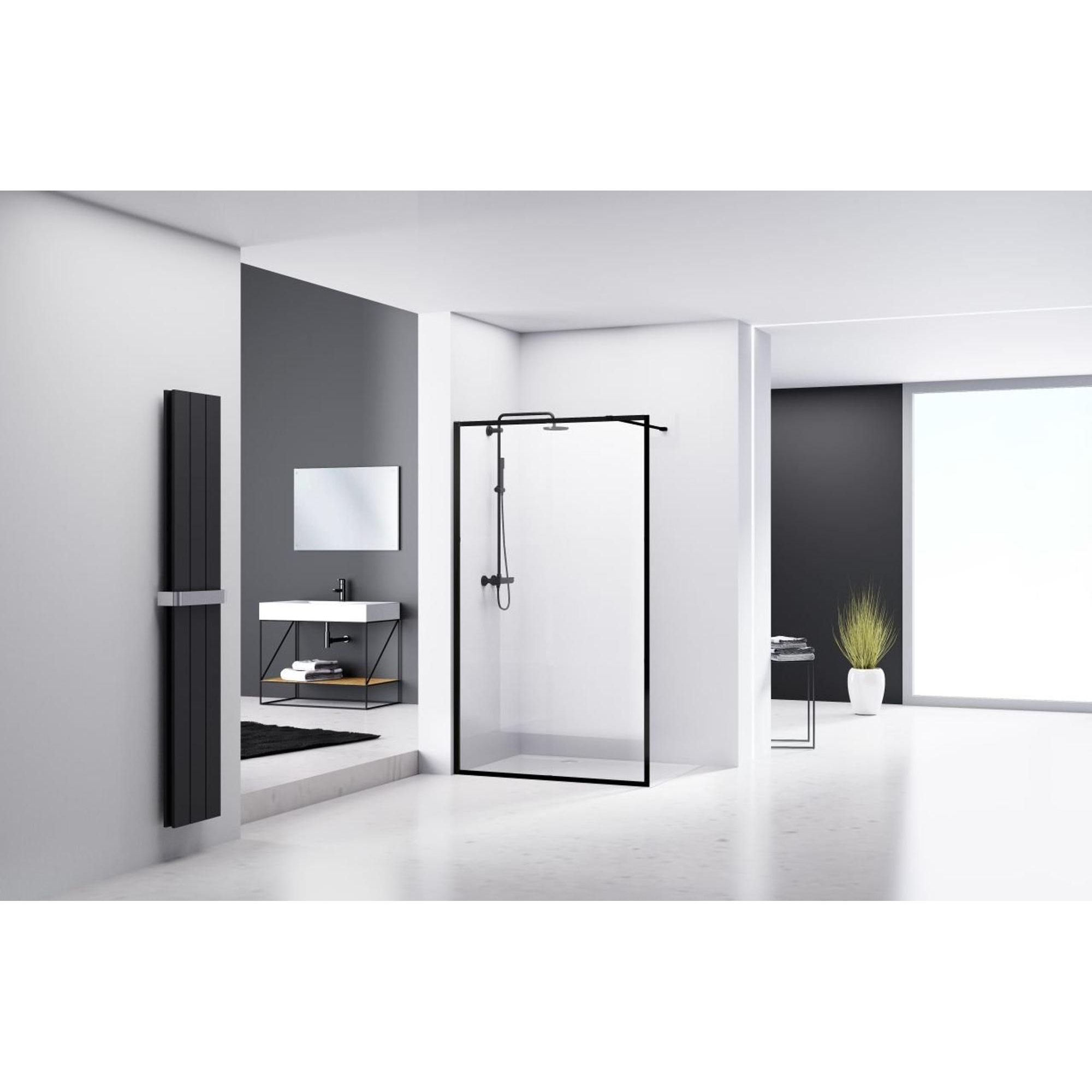 Van Rijn Products ST04 Vaste wand 97-99 cm breed 8mm helder glas 200cm hoog, aluminium omkaderd profiel zwart incl. stabilisatiestang 120cm