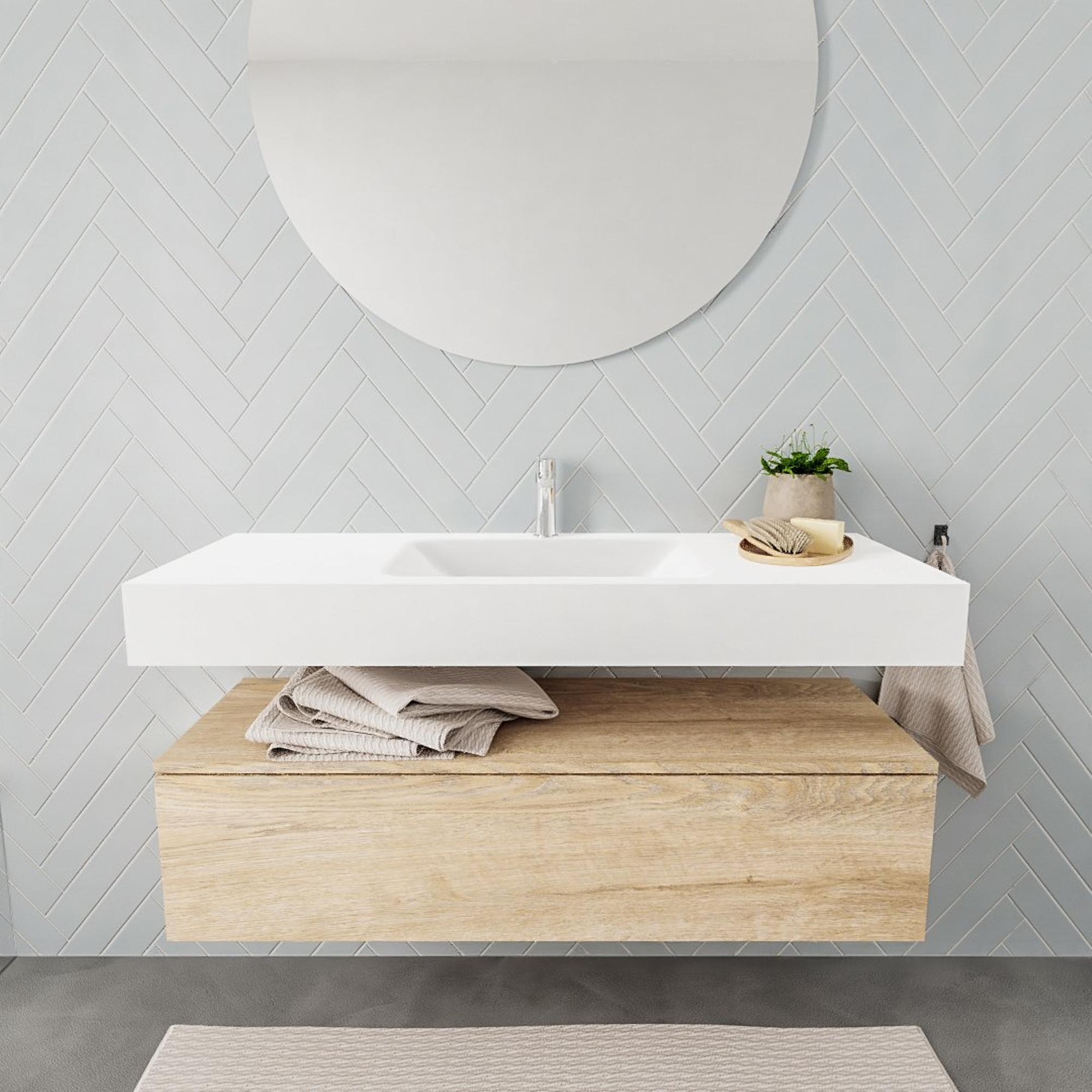 MONDIAZ ALAN 120cm - onderkast - washed oak - 1 lade - vrijhangende wastafel - wasbak midden - 1 kraangat - talc