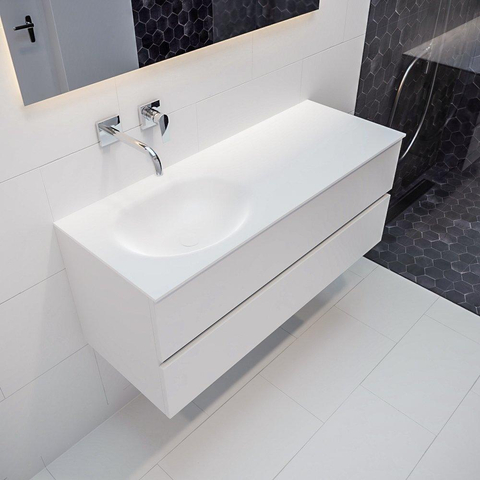 MONDIAZ VICA Badkamermeubelset - 120cm - 2 lades - wasbak Moon links - 0 kraangaten - solid surface talc