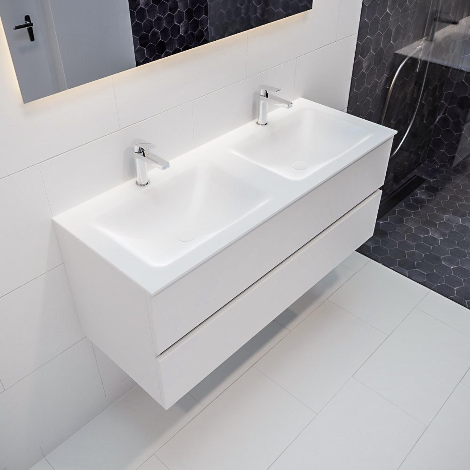 MONDIAZ VICA Badkamermeubelset - 120cm - 2 lades - wasbak Cloud dubbel - 2 kraangaten - solid surface talc