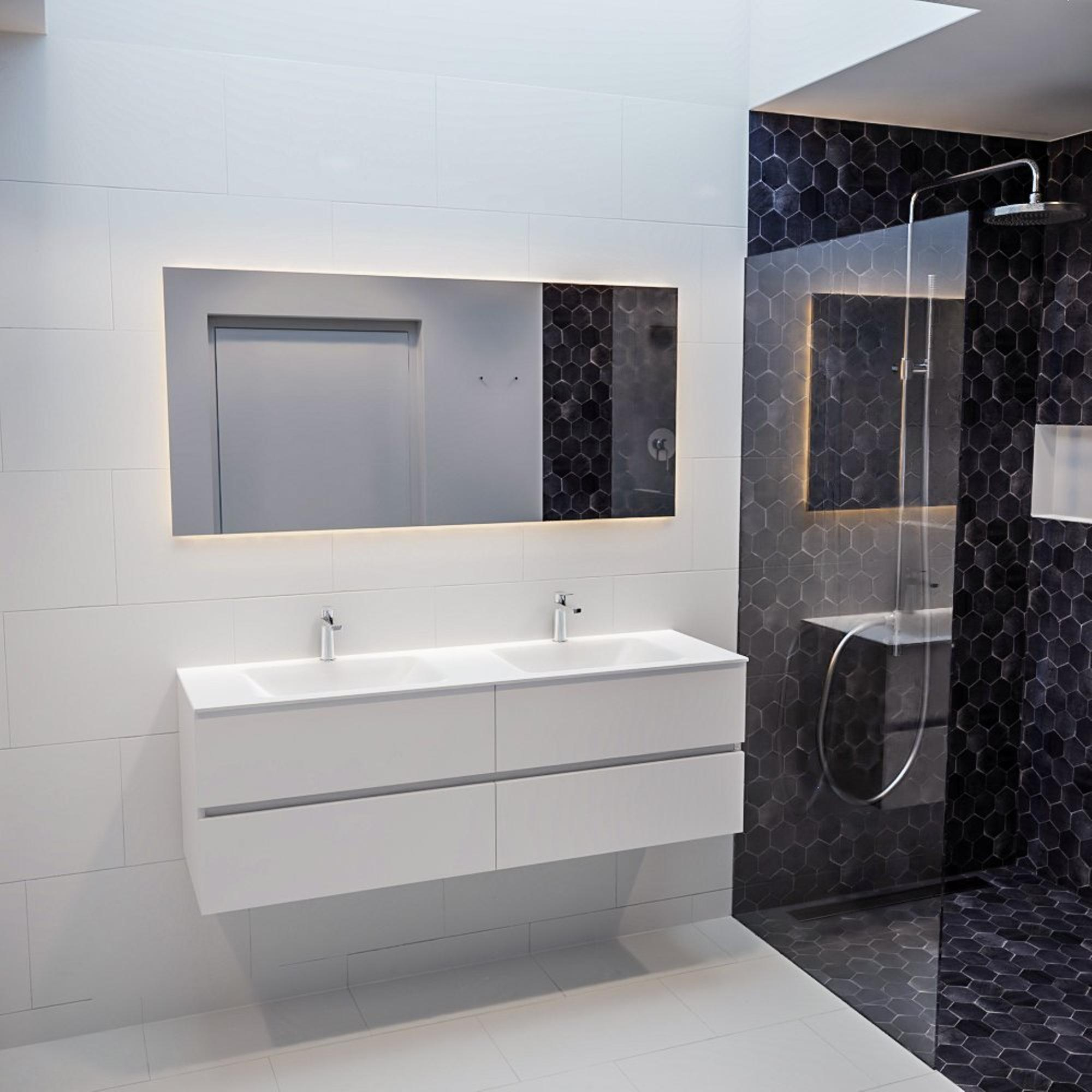 Dit badkamermeubelset straalt stijl en klasse uit. De combinatie van de Cloud dubbele wasbak en het solide surface materiaal in talc geeft een luxueuze uitstraling aan de badkamer. De gladde afwerking en strakke lijnen zorgen voor een tijdloos design dat jarenlang meegaat en moeiteloos past bij zowel moderne als klassieke badkamerinrichtingen.